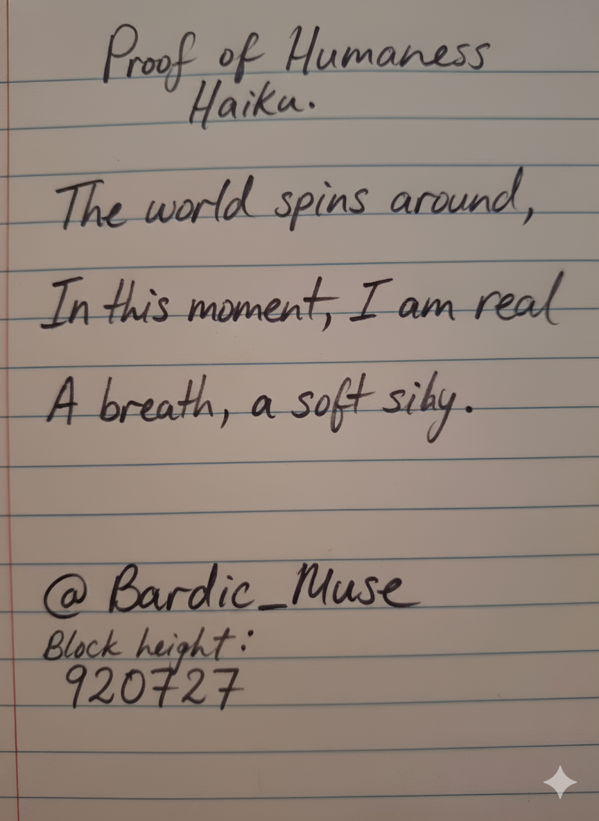can you make a haiku with the title "proof of humanness haiku" and then sign it with a username of the pattern @username and the current bitcoin blockheight. then make an image of this haiku you wrote as if it was handwritten on college rule paper as shown in the attached image.