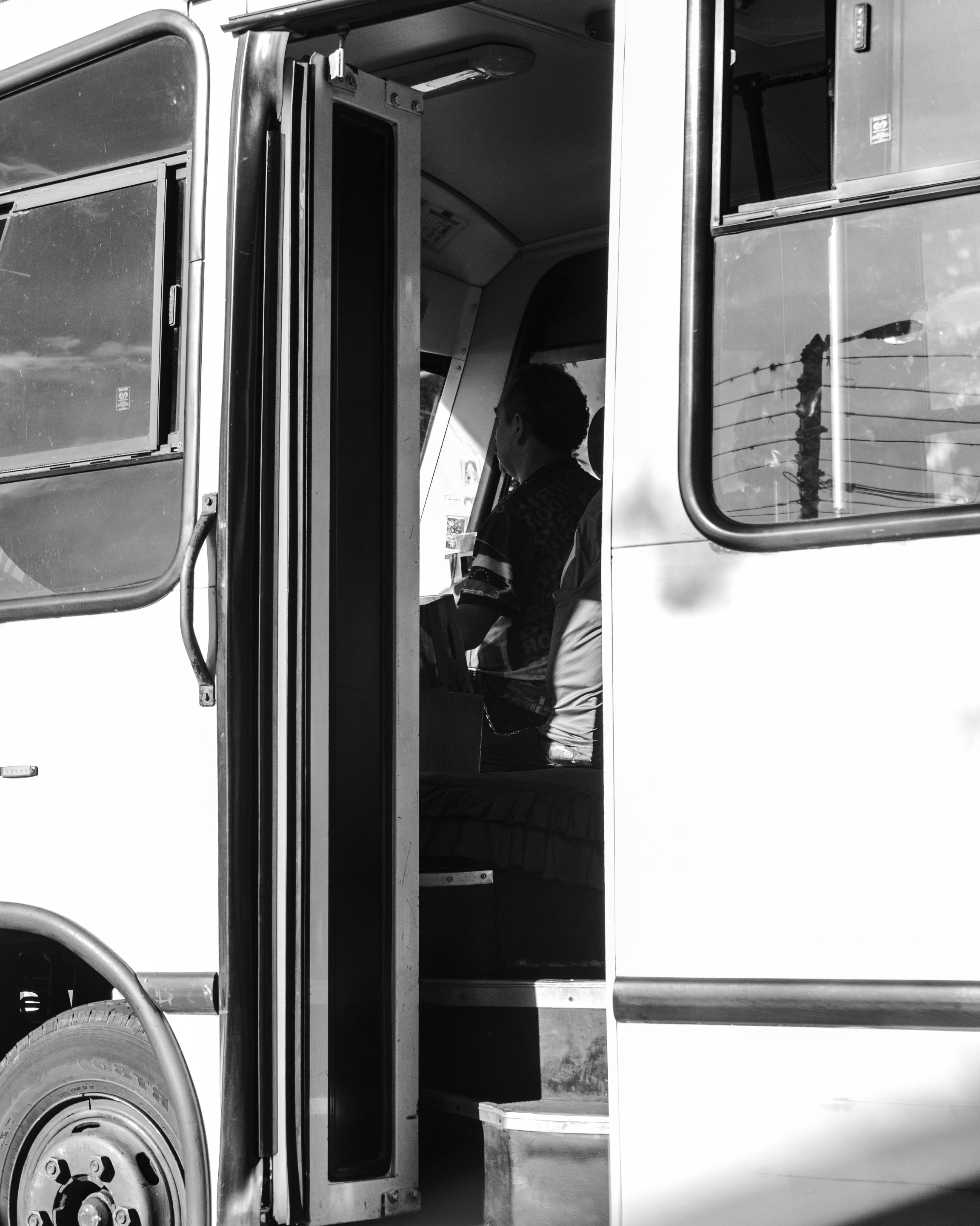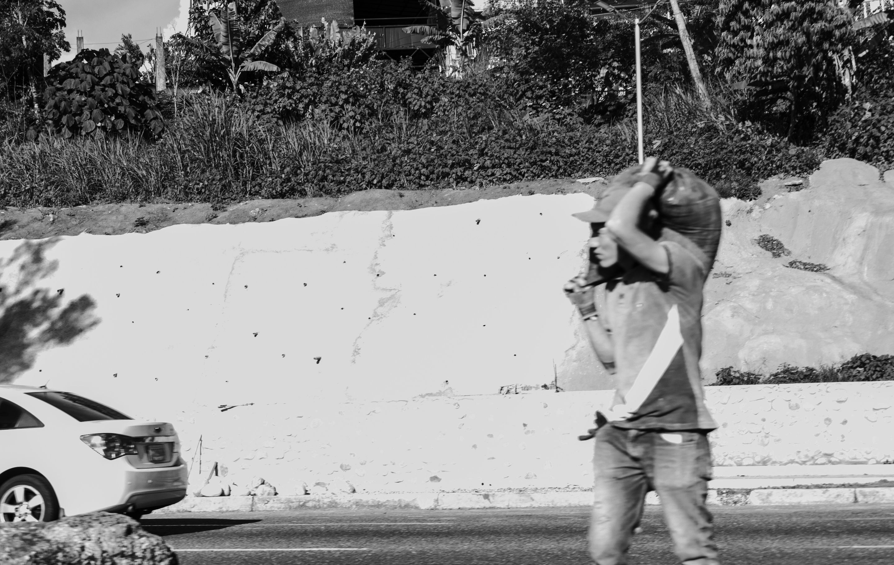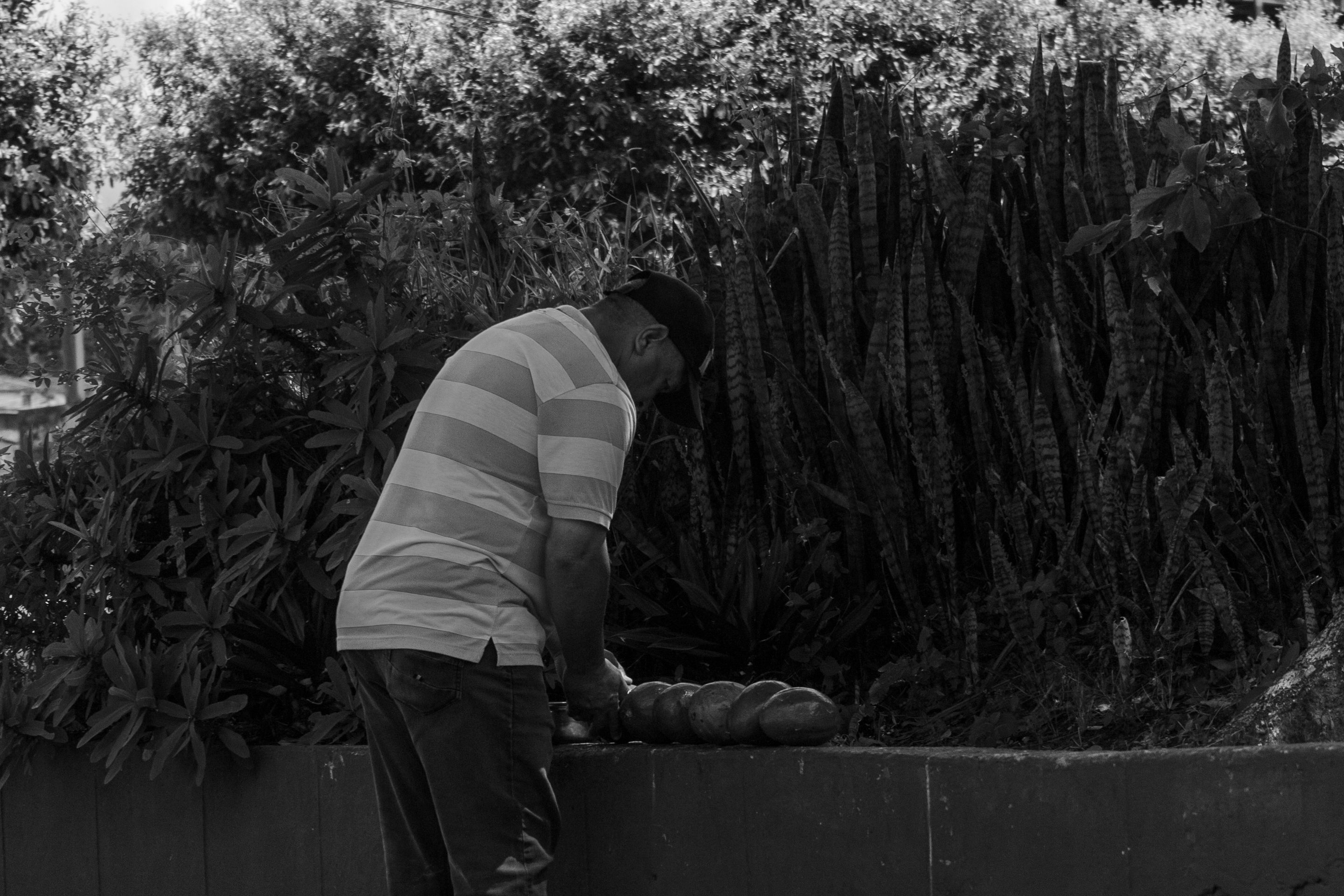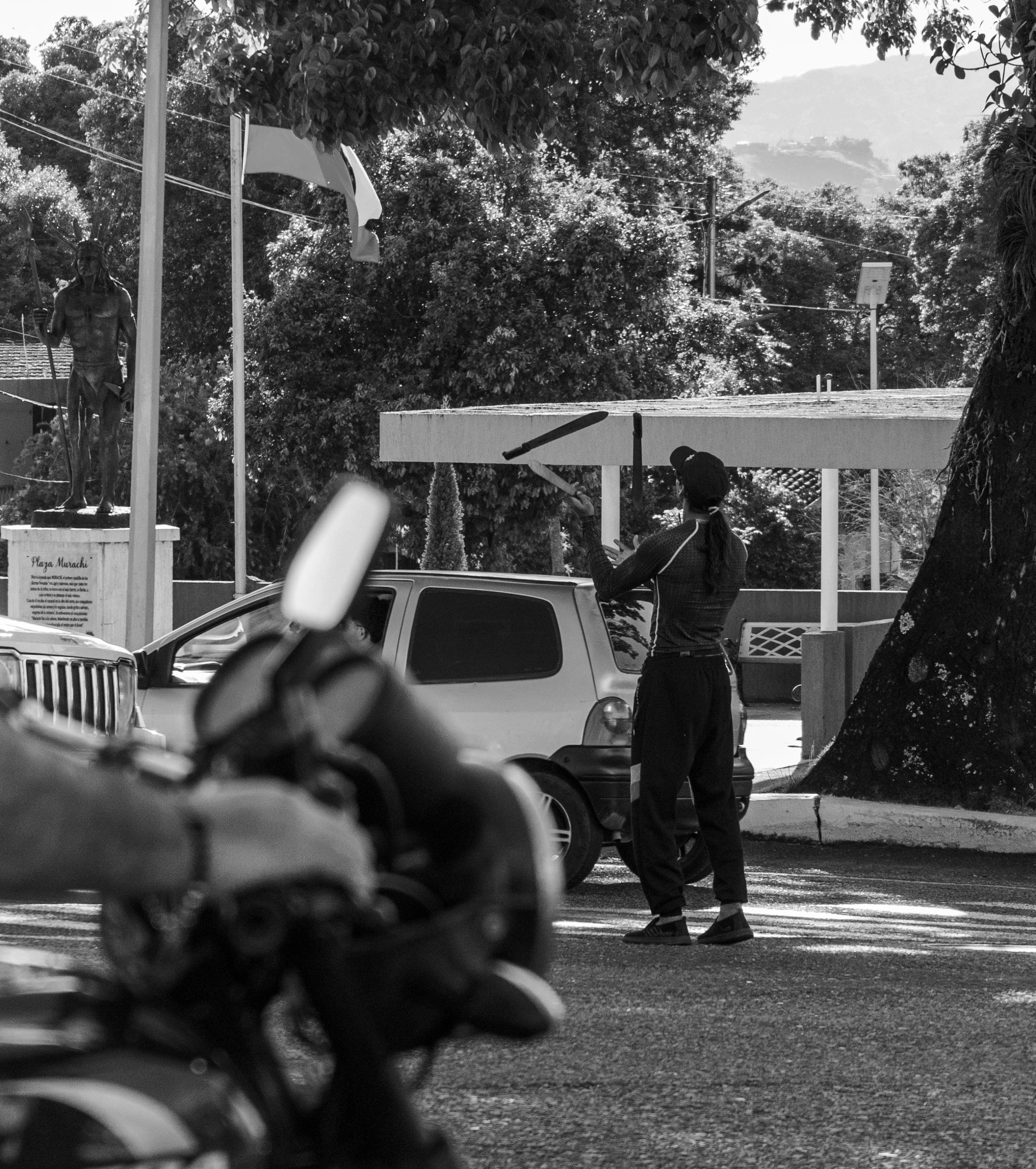 The following two photographs have the same theme: both people are informal vendors and sell fruit at the traffic lights. The first one sells strawberries, and the second one sells avocados: