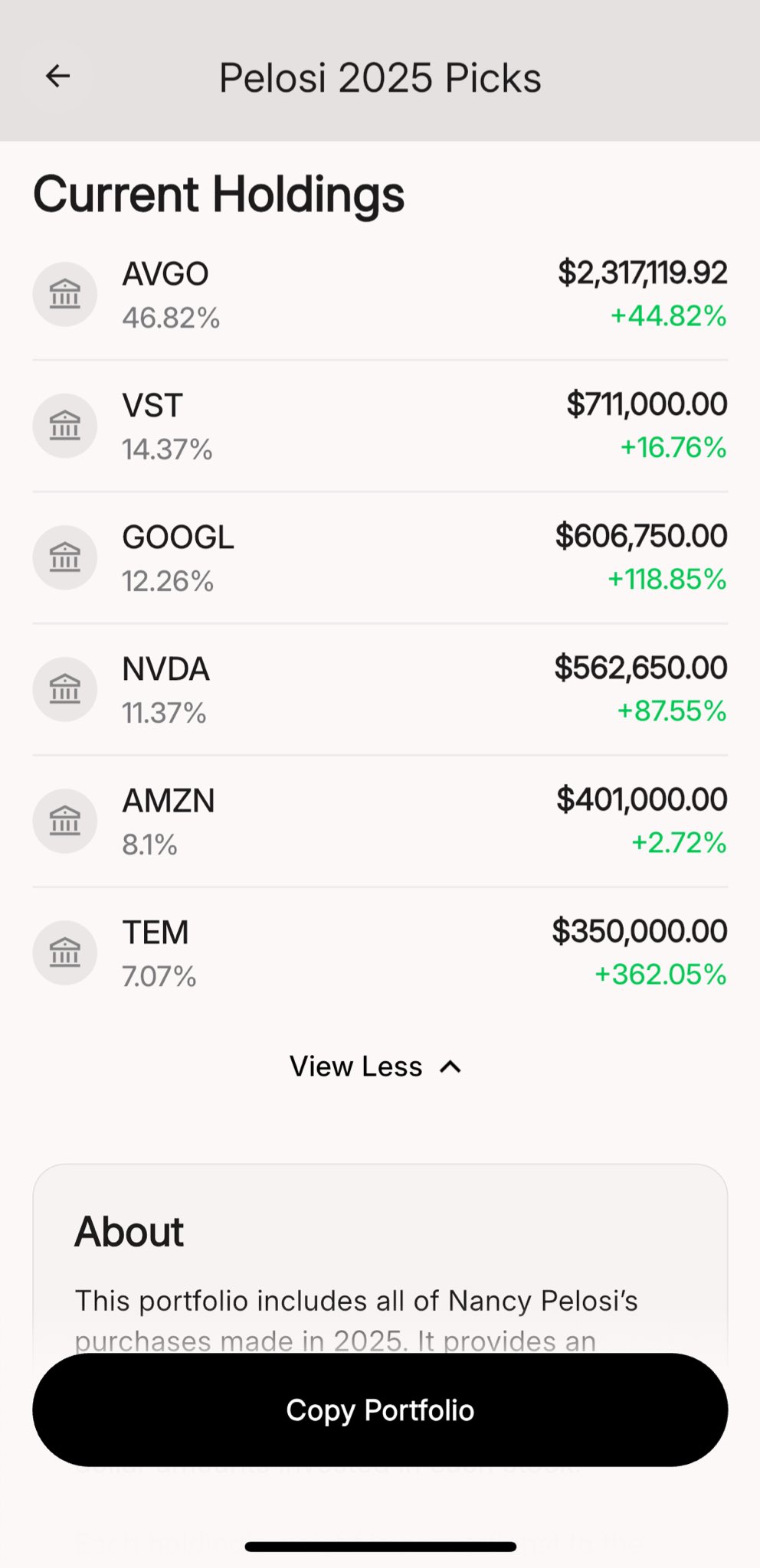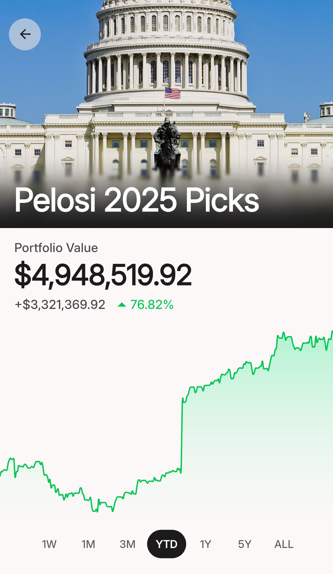 A young man created an app to monitor all of Nancy Pelosi's former Speaker of the U.S. House of Representatives trades and replicates them automatically. He doesn't check indicators or charts when the alert goes off; he buys along with it. +76% this year.