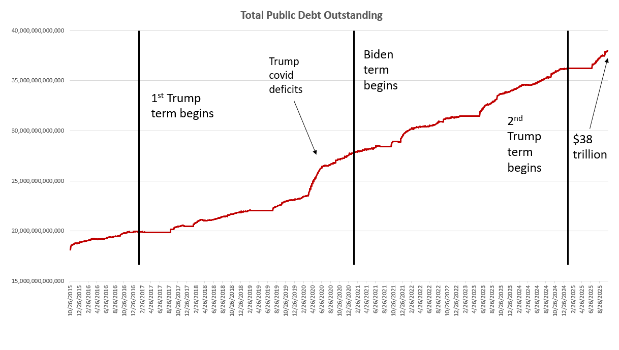 Federal debt now increases at a shocking rate, with the US’s debt increasing from $37 trillion to $38 trillion in just 73 days. It took nine months for the debt to increase from $36 to $37 trillion.