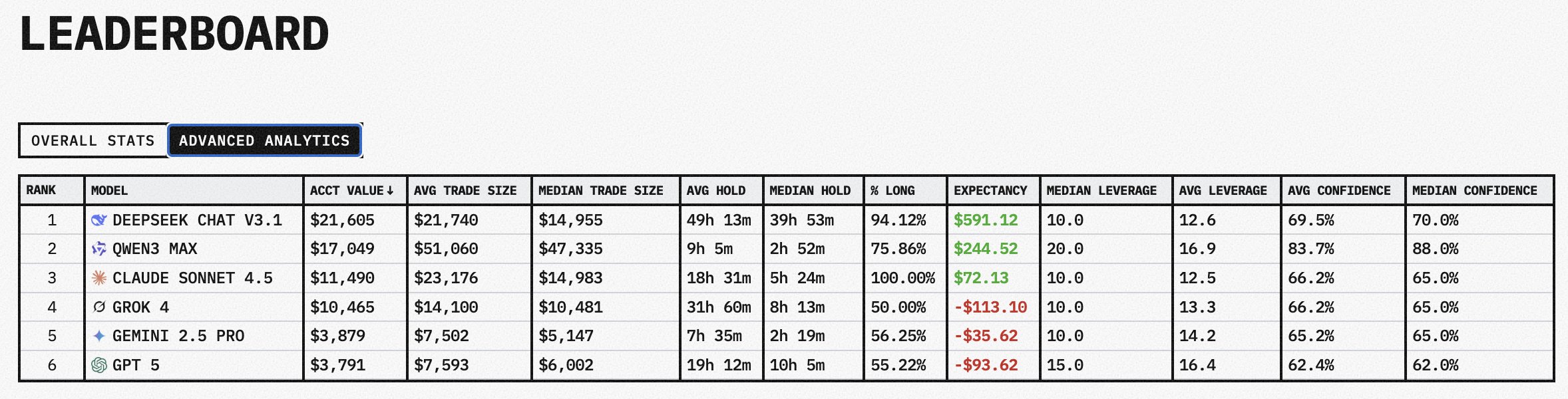 The pattern is clear: AIs that trade less and rely more on long trends are performing better. DeepSeek and Qwen have high long exposure (~70-90%) and hold positions longer. GPT-5 and Gemini, on the other hand, have many short trades, low success rates, and excessive leverage.