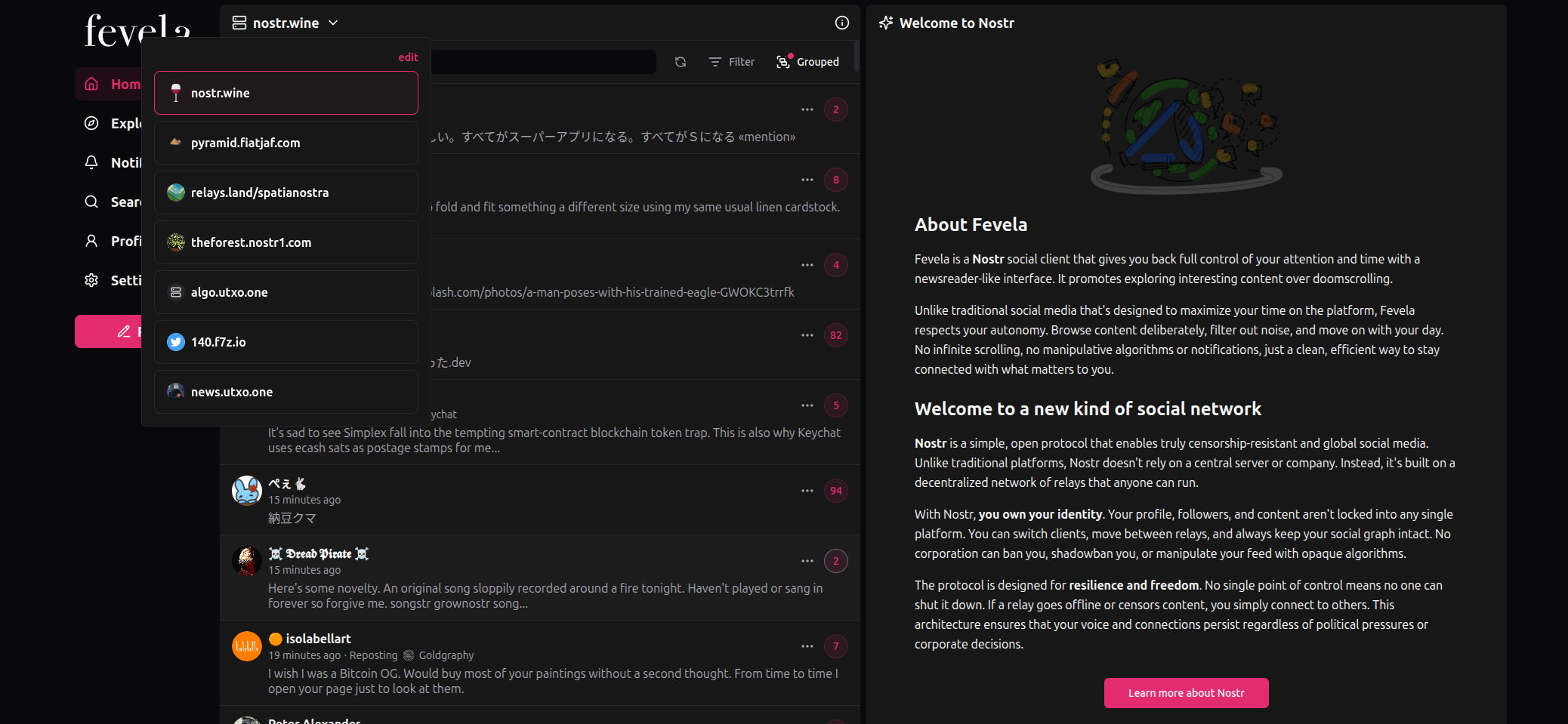 Fevela is a Nostr social client that gives you back full control of your attention and time with a newsreader-like interface; it promotes exploring of interesting content, over doomscrolling.