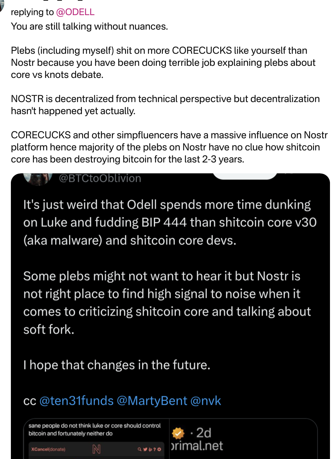 I find your nostr thread amusing, because I see more criticism of Core than Knots, which I'm sure just speaks to how silos are already going up around each of us on the new social media thing.