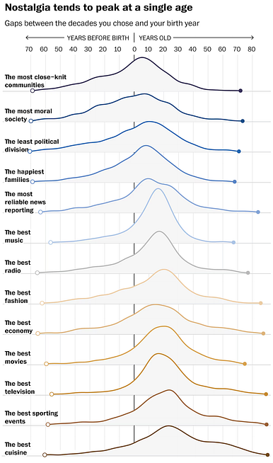 This was fascinating -- was just talking about this topic (of when different aspects of life seemed to have been at their best) w/ someone. The implications are significant -- if you think that everything sucks, and the world is so much worse than it used to be, and you then discover that everyone thinks that in predictable ways, it should give you pause.