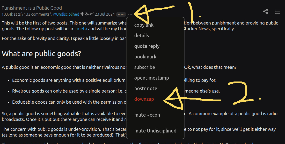 downzap it. This is like zapping, but it has a negative effect on visibility instead of positive. Folks might zap posts that feel like slop or they might downzap an item because they are pissed at the author or because they think a post or comment is mean or because it's a distraction from a conversation or simply because they feel like it. All stackers can downzap. Just click on the three little buttons next to any post or comment and select downzap.How to downzap
