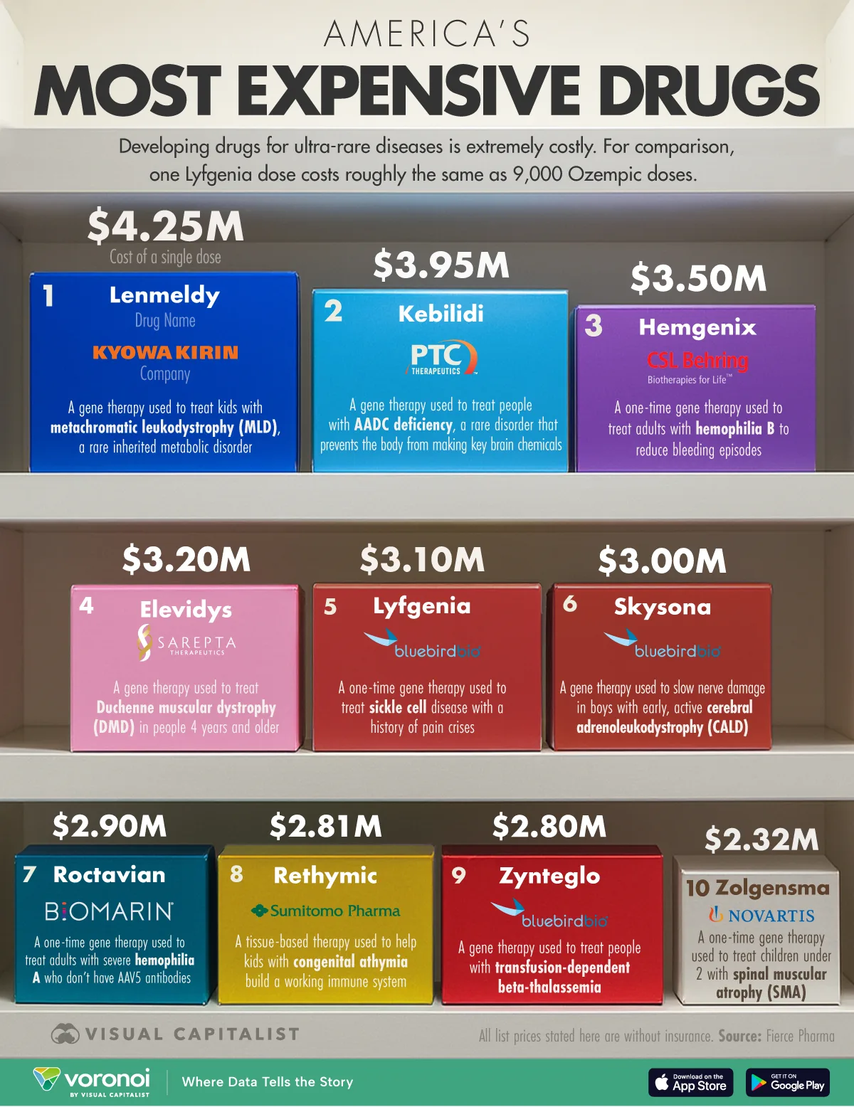 The latest ranking of America’s most expensive drugs highlights how a single treatment can rival the price of a luxury home.The data for this visualization comes from Fierce Pharma. It lists the 10 priciest U.S. drugs, all topping $2 million per course and most offering one-time, potentially curative benefits