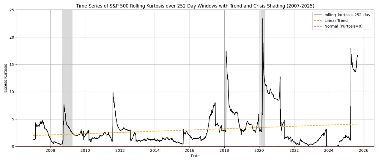 What we’re interested in is not “is the VIX increasing over time” but rather “are the spikes of the VIX getting bigger, and more frequent”. When you fatten the tails in a distribution, you decrease the frequency of small-scale volatility and increase the outliers. The term we use for measuring this fatness is kurtosis. Looking at the kurtosis of SPY’s price action over an annualised window, you’ll see a small and steady increase since 2007.