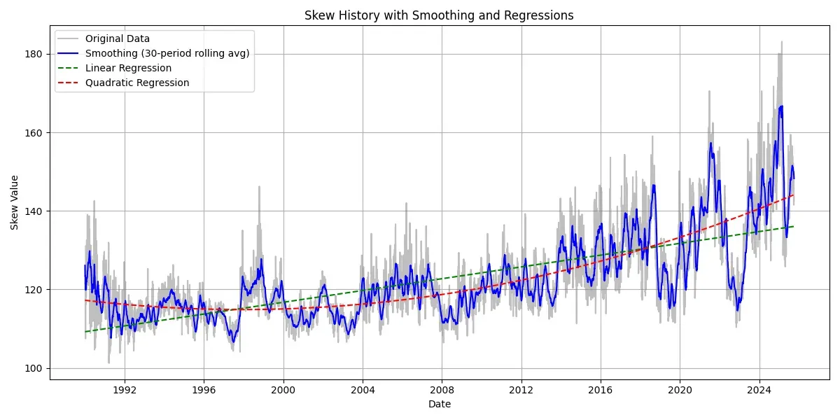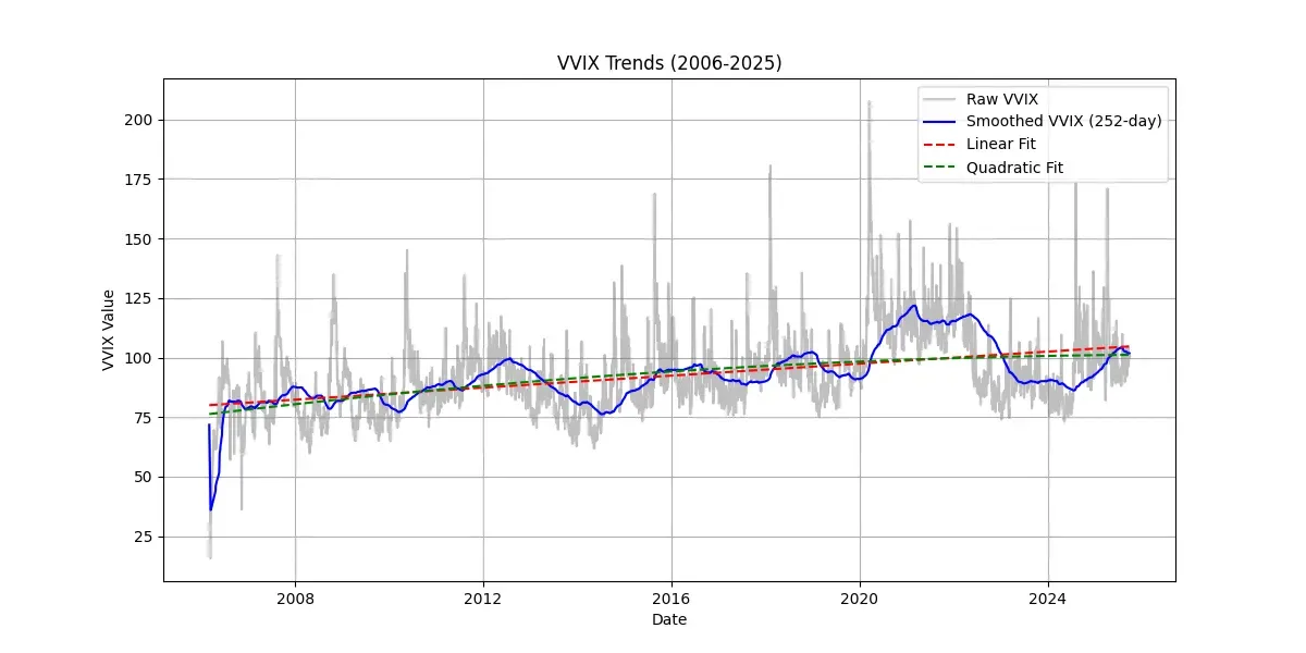 We’re interested not in how volatile the index is, but how volatile it’s volatility (vol-of-vol) is. Vol-of-vol is not quite the same as kurtosis, but it’s a good enough proxy for us. The index for this - the VVIX - has data from 2006 onwards. Looking at the VVIX, there’s a bunch of noise but again we’ve got a small uptrend over the same timeframe.