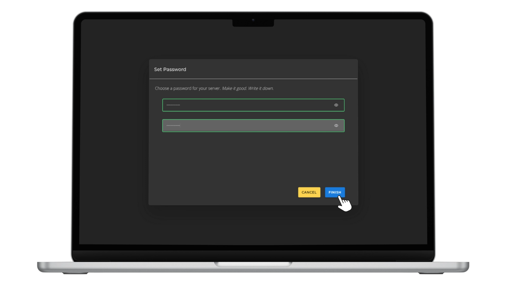 Password for the server must then be created. Start9 advises creating a robust password and recording it. Click FINISH to proceed.A screen will indicate that StartOS is initializing and setting up the server. The next step is to