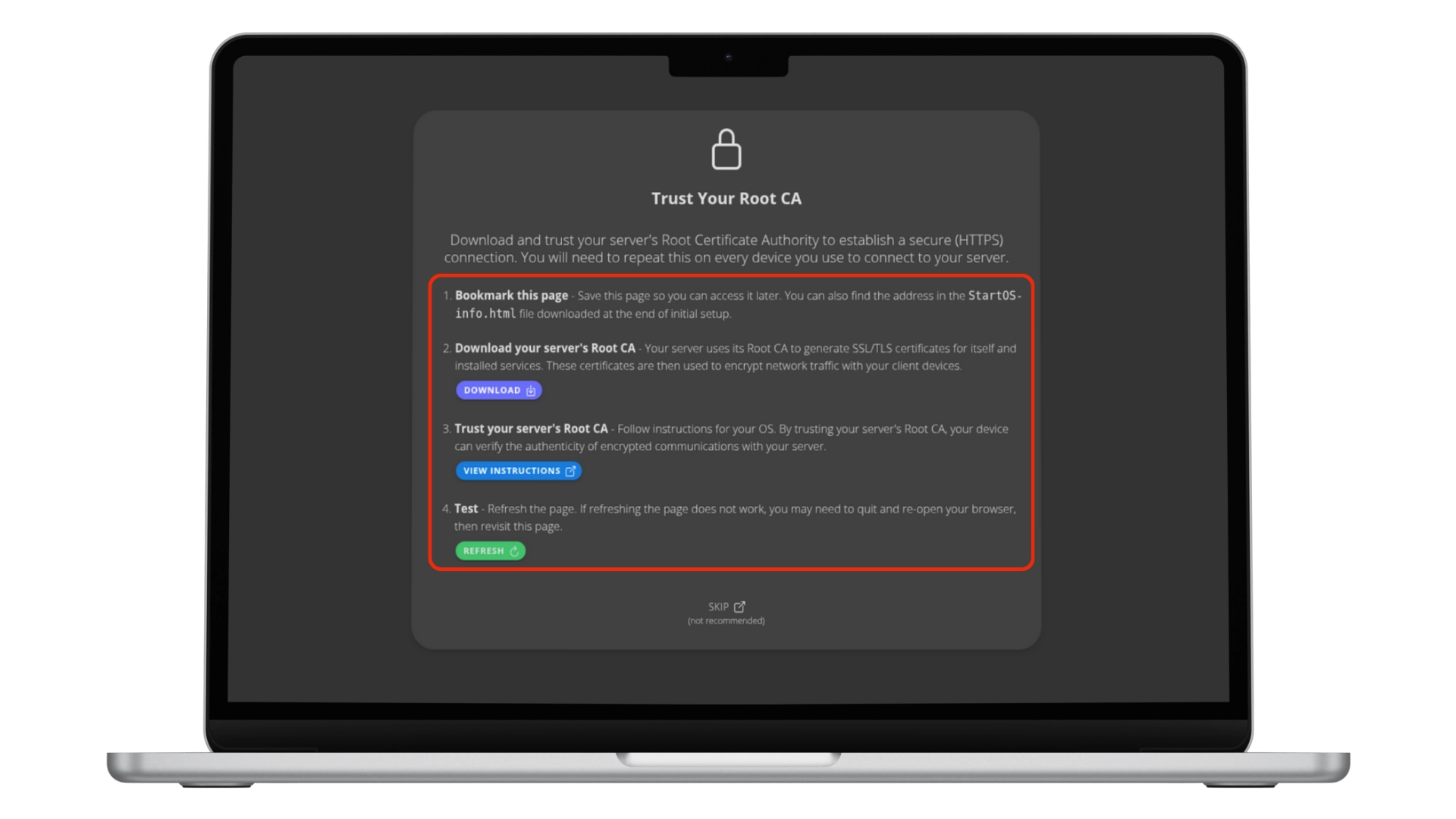 local network (LAN) and another for secure access via Tor. Both addresses should be saved in a secure password manager. The next step is to Trust your Root CA. Open a new browser tab and follow the instructions to trust the Root CA and log in. The Root CA certificate can also be downloaded by clicking Download certificate in the downloaded file.5️⃣ Trust your Root CA