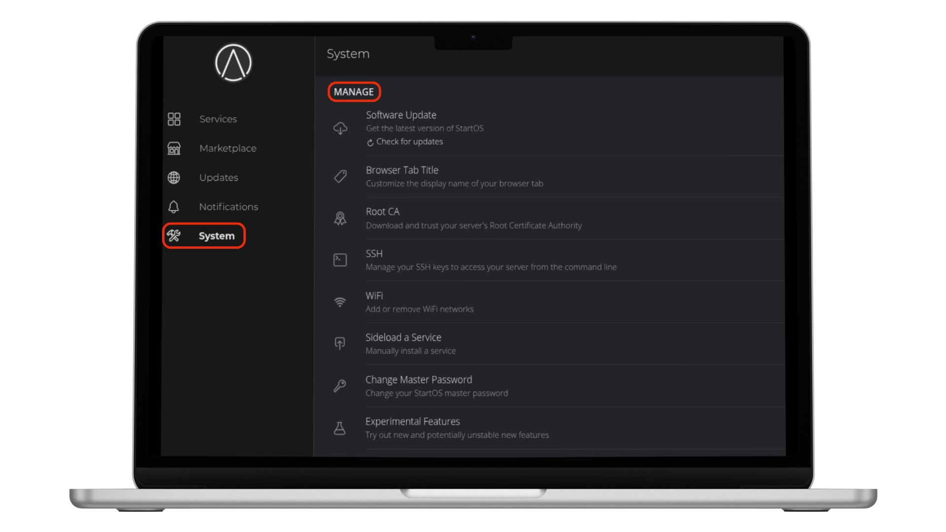 Manage section in the Systems tab allows for control over key system functions. Users can manually check for and apply StartOS updates, maintaining control over the system update process. It is possible to sideload custom or third-party services not available in the official marketplace. If the server is not connected via Ethernet, Wi-Fi settings can be configured from this section. Advanced users can enable SSH access for terminal-level system management.The