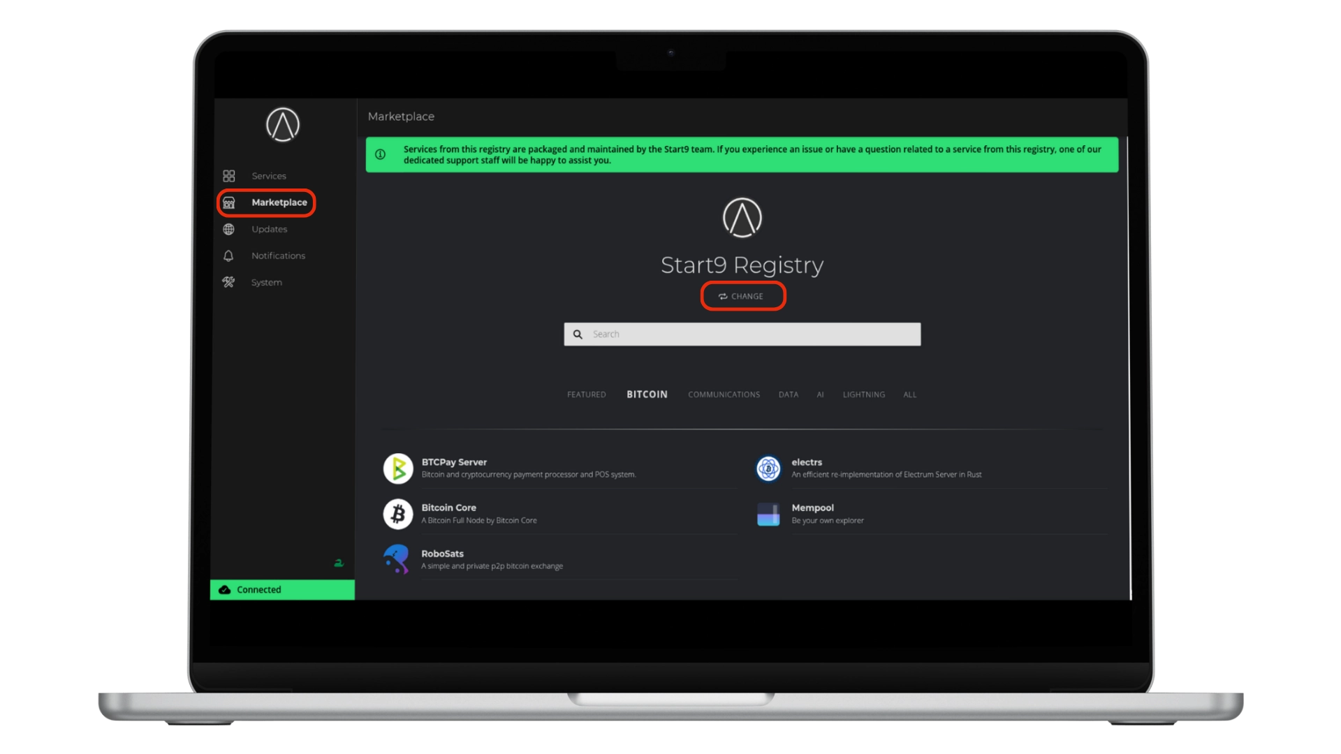 Marketplace is used to discover, install, and manage services on the personal server. It provides access to software such as Bitcoin Core, BTCPay Server, and electrs. StartOS supports multiple marketplaces, including the official Start9 Registry and community-run registries. These can be added by clicking CHANGE and switching to the Community Registry, which provides access to a broader range of services.9️⃣ Installing a Bitcoin Full Node