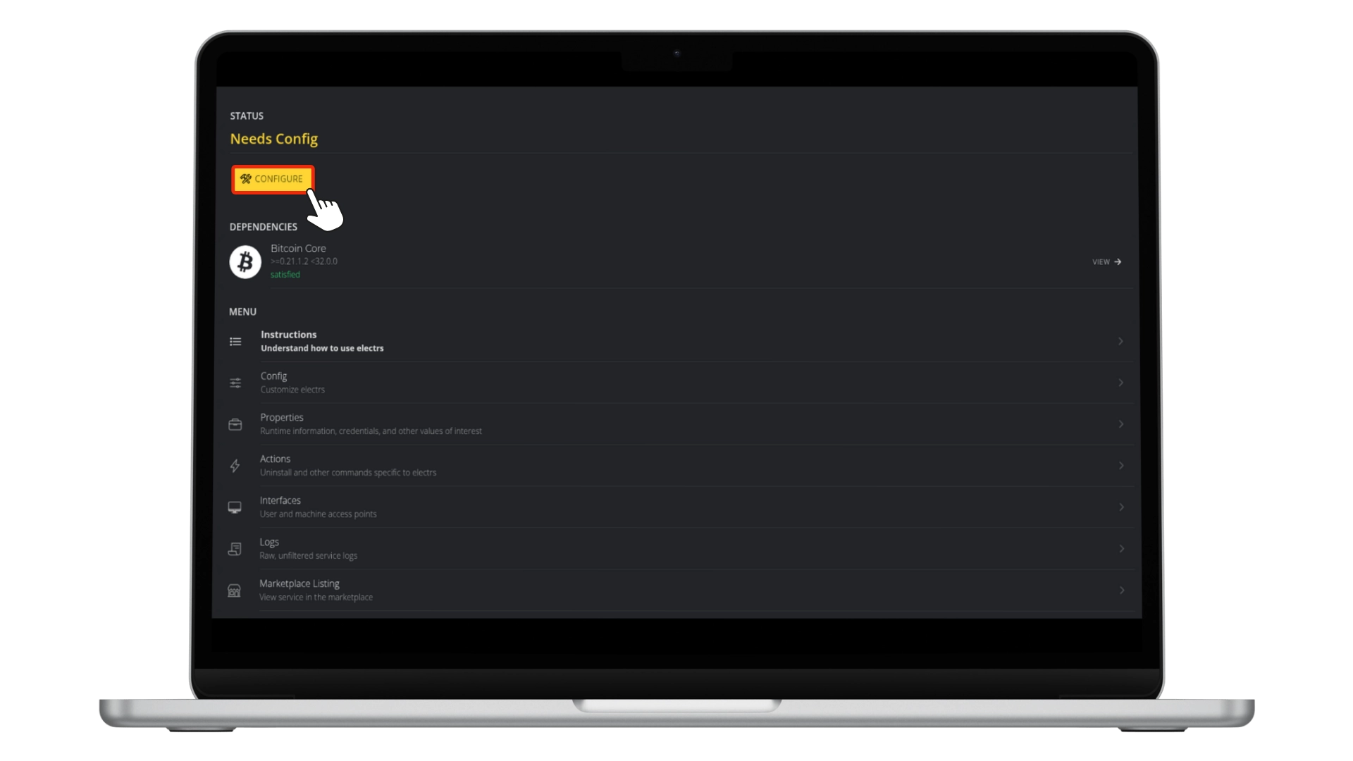 Needs Config prompt will appear, requiring settings to be completed before the service can run. This typically occurs after updates or fresh installations and prompts a review of RPC settings. Proceed with the default configuration and click Save.Once installed, Bitcoin Core will begin synchronizing with the blockchain, a process that can take several hours to days depending on hardware and internet connection. Once full synchronisation has been completed, other services can be connected, such as an Electrum server using