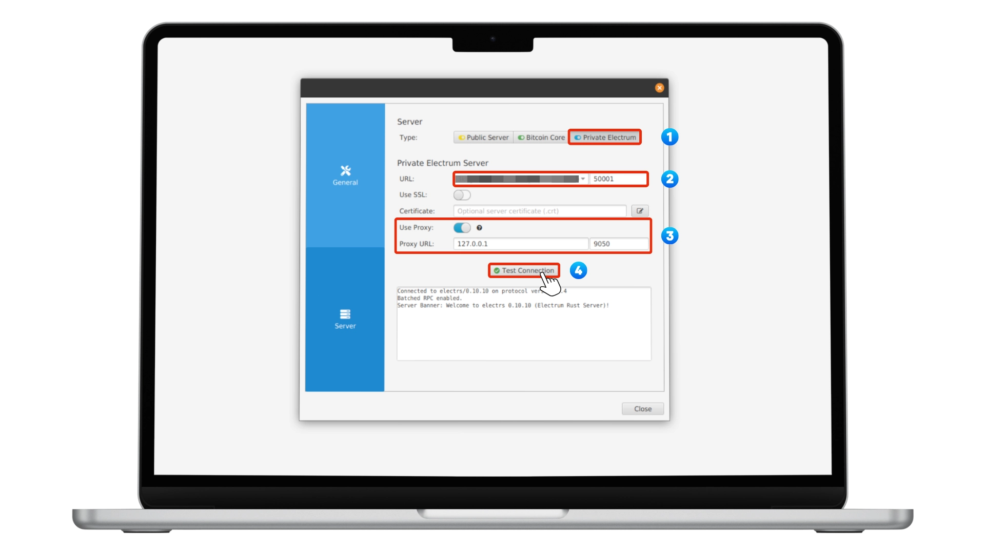 Use Proxy, setting the proxy address to 127.0.0.1 and port to 9050. Click Test Connection and wait a few moments. A successful connection will display a confirmation message such as Connected to electrs. Once verified, close the settings and proceed to create or restore your wallet. This setup ensures your wallet queries your own node via electrs, providing full privacy and trustless operation.That's it! I hope you're also able to run your own personal server with StartOS now! ✌️