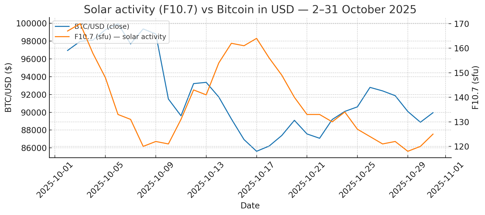 I plotted daily Bitcoin price in USD (close) against solar radio flux F10.7 for 2–31 October 2025 to check whether solar activity might be nudging the market.