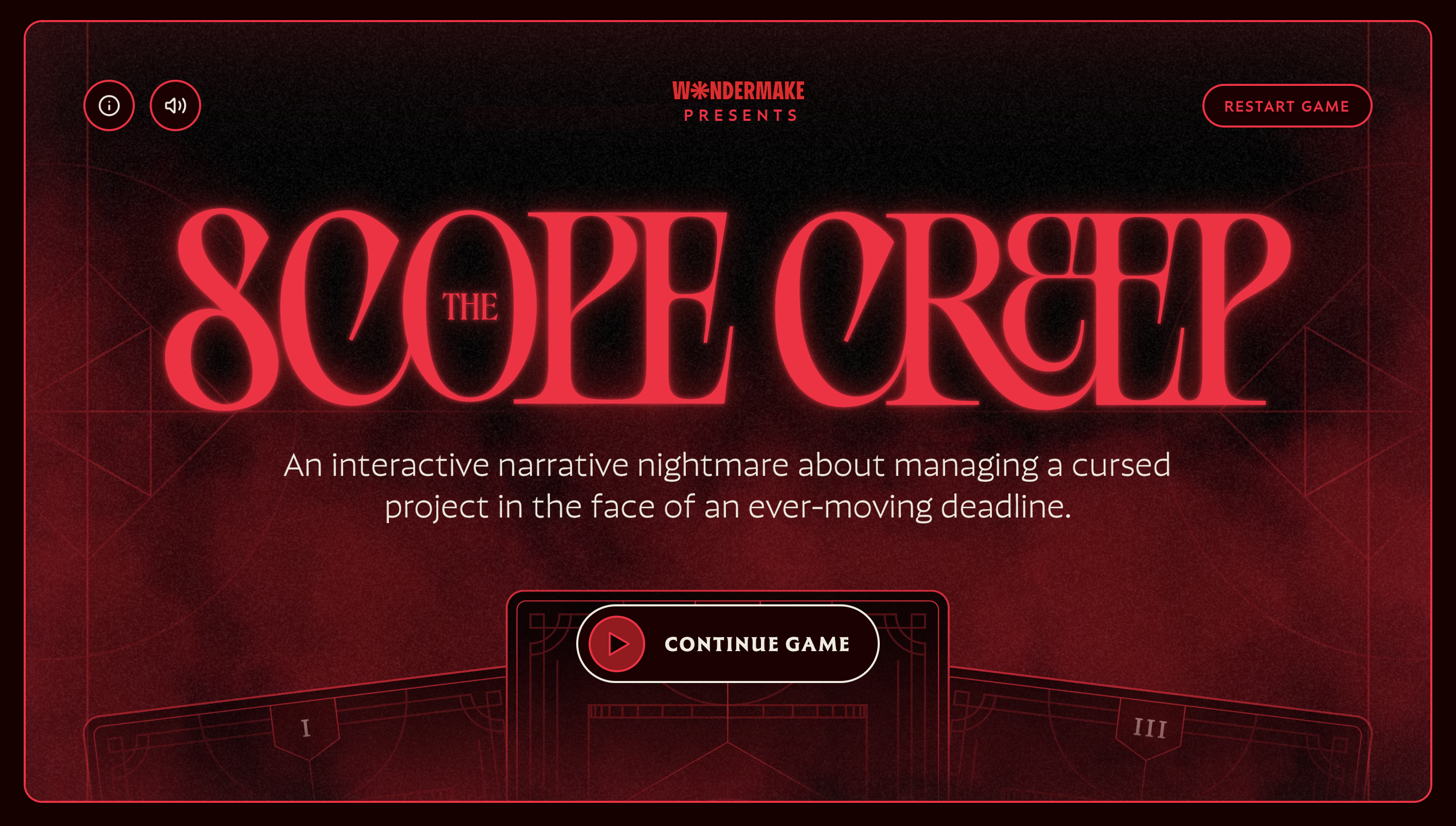 Welcome to The Scope Creep, an interactive narrative nightmare experience for the creative industry about managing a cursed project in the face of an ever-moving deadline.