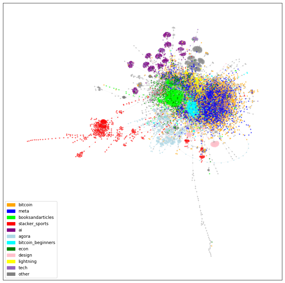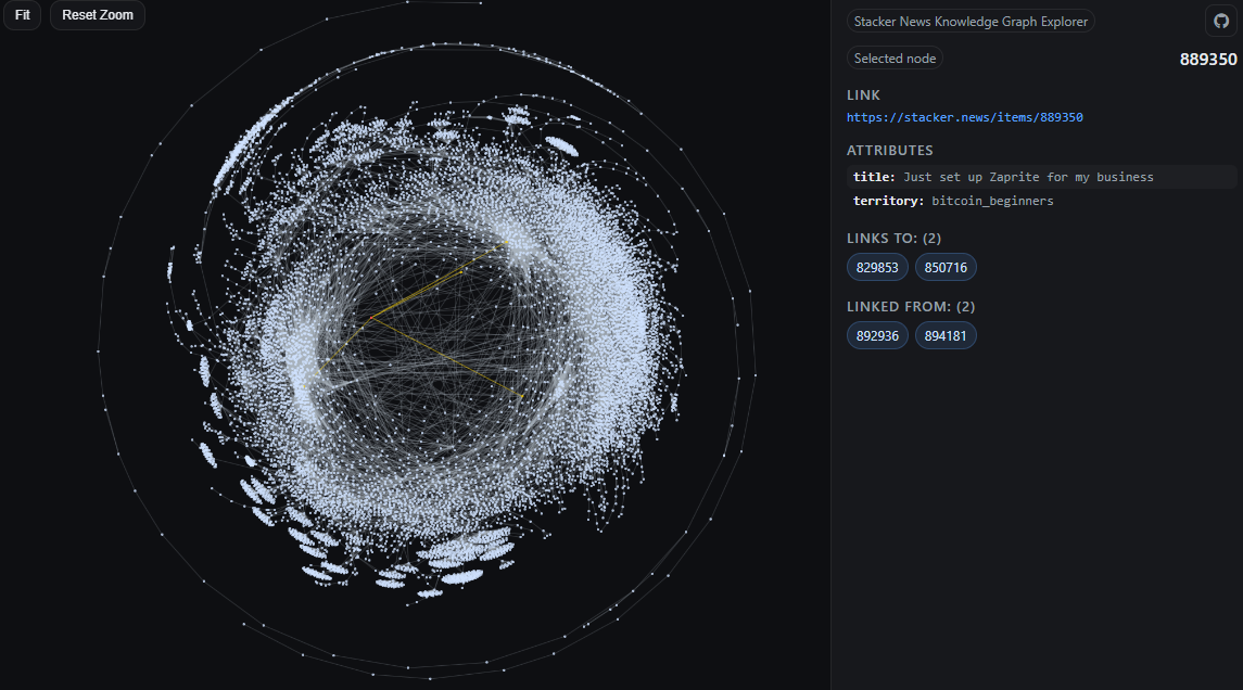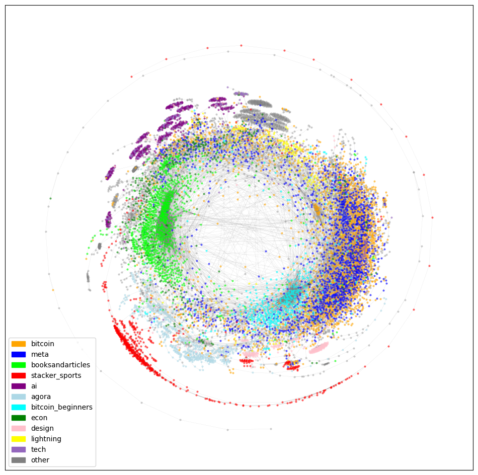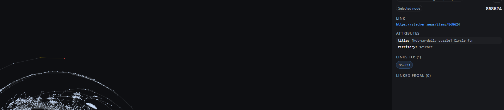 It shows the largest connected component of the network generated from Stacker News posts, connected via internal SN links.