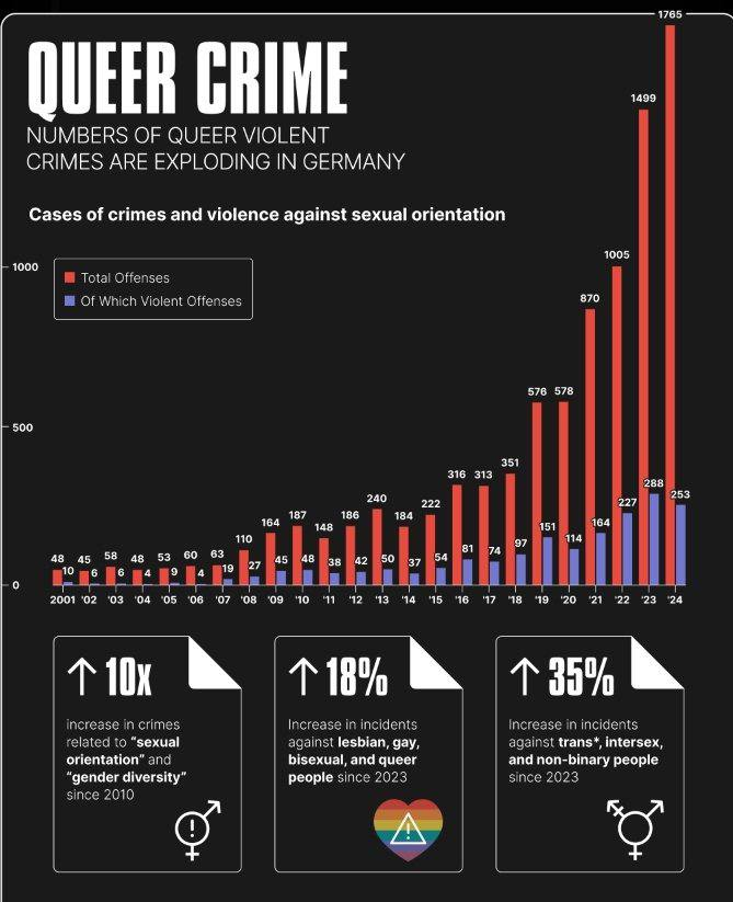 The top of 1765 crimes a year is not very high for a population of over 80million people. When queer people feel offended because you used the wrong pronoun it can be considered a crime in germany. I bet there is zero deaths in this statistic and lot of online violence in the violence statistic.