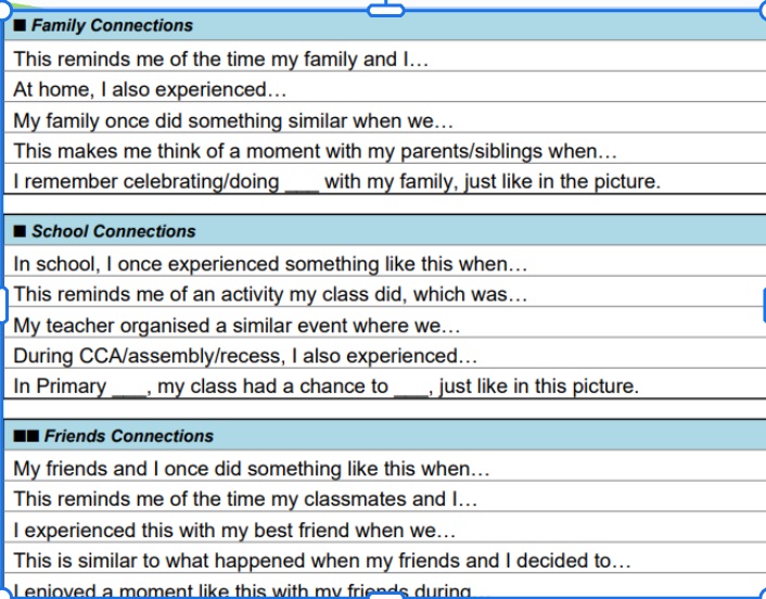 - Think of an onion & generate possible questions based on its different layers, such as personal, family, school, & society/Singapore.