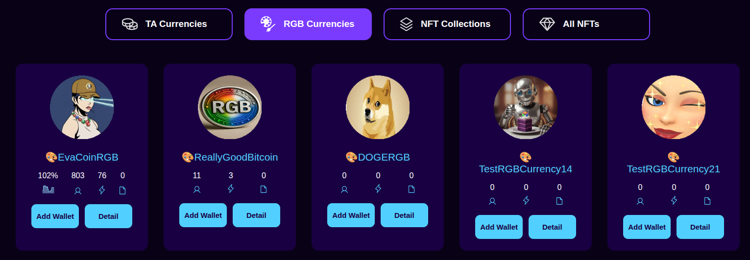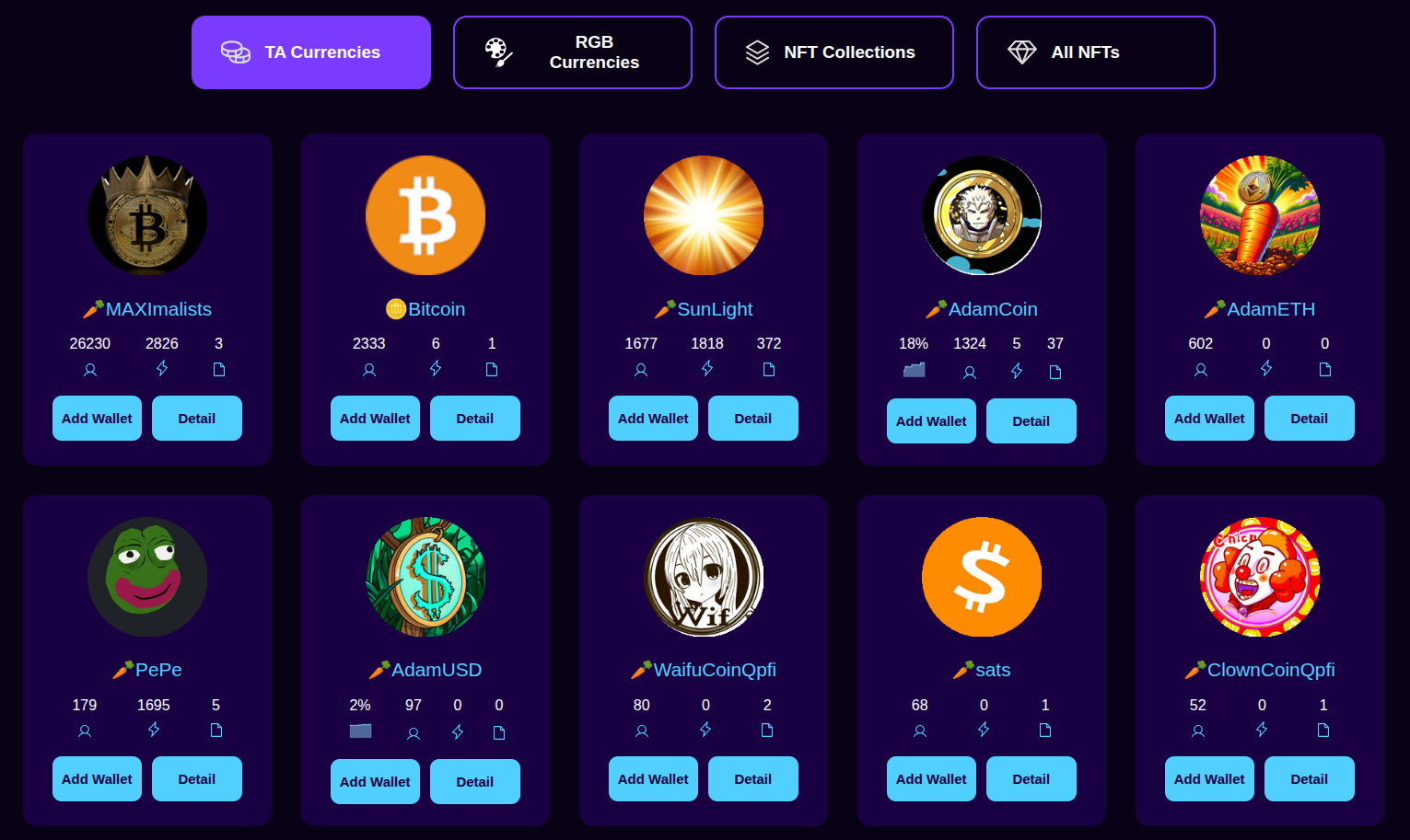 I also noticed that they had a tab for RGB assets. It turns out Tiramisu Wallet supports not one very late-blooming protocol, but two! Unfortunately, the RGB assets looked worse than the Taproot Assets: