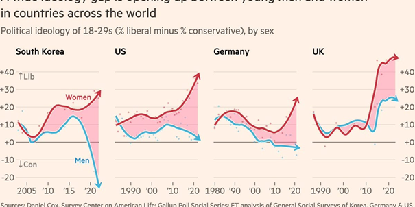"As men have drifted to the right and women have become more liberal in America and parts of Europe, politics is getting in the way of pillow-talk,”