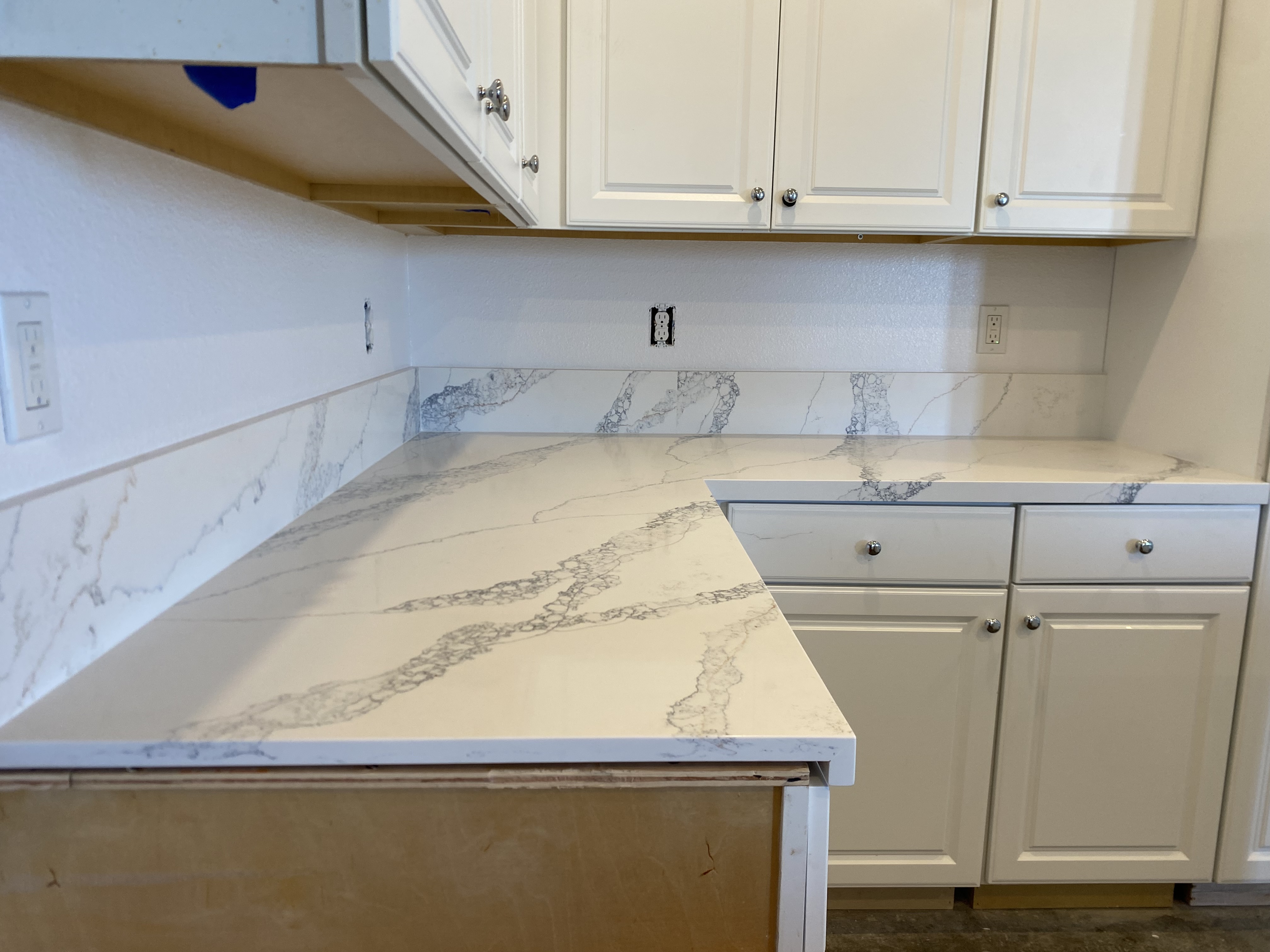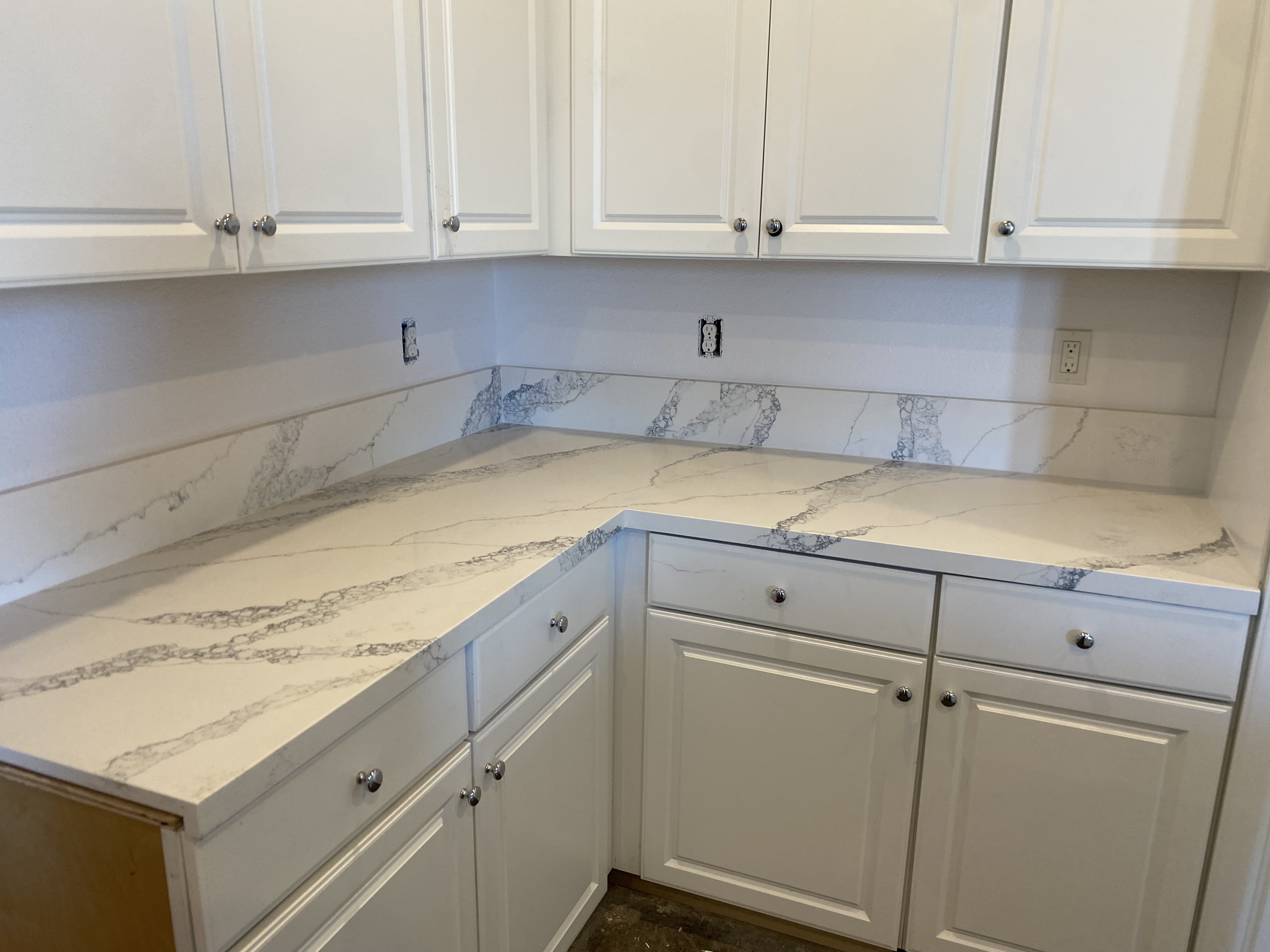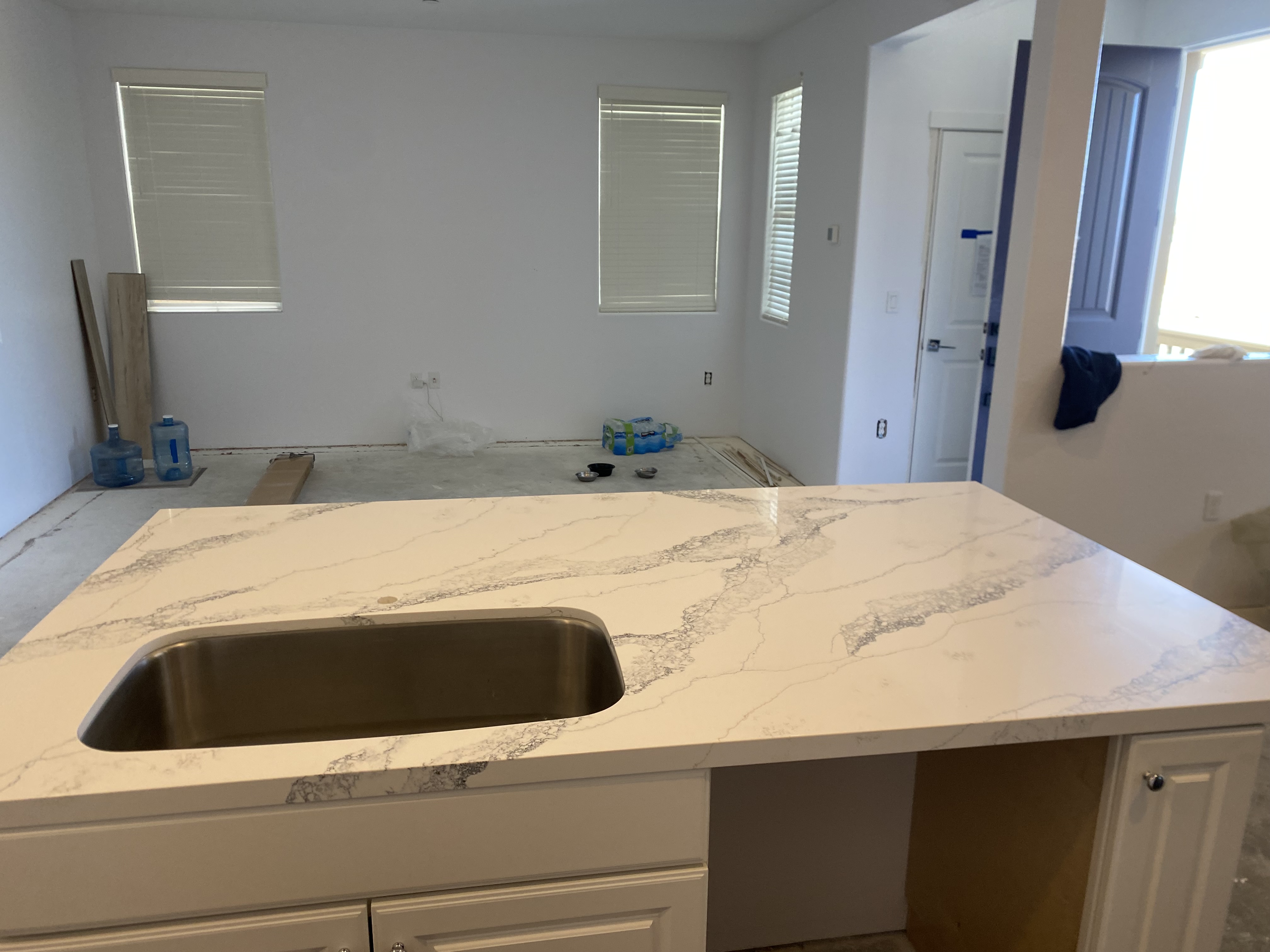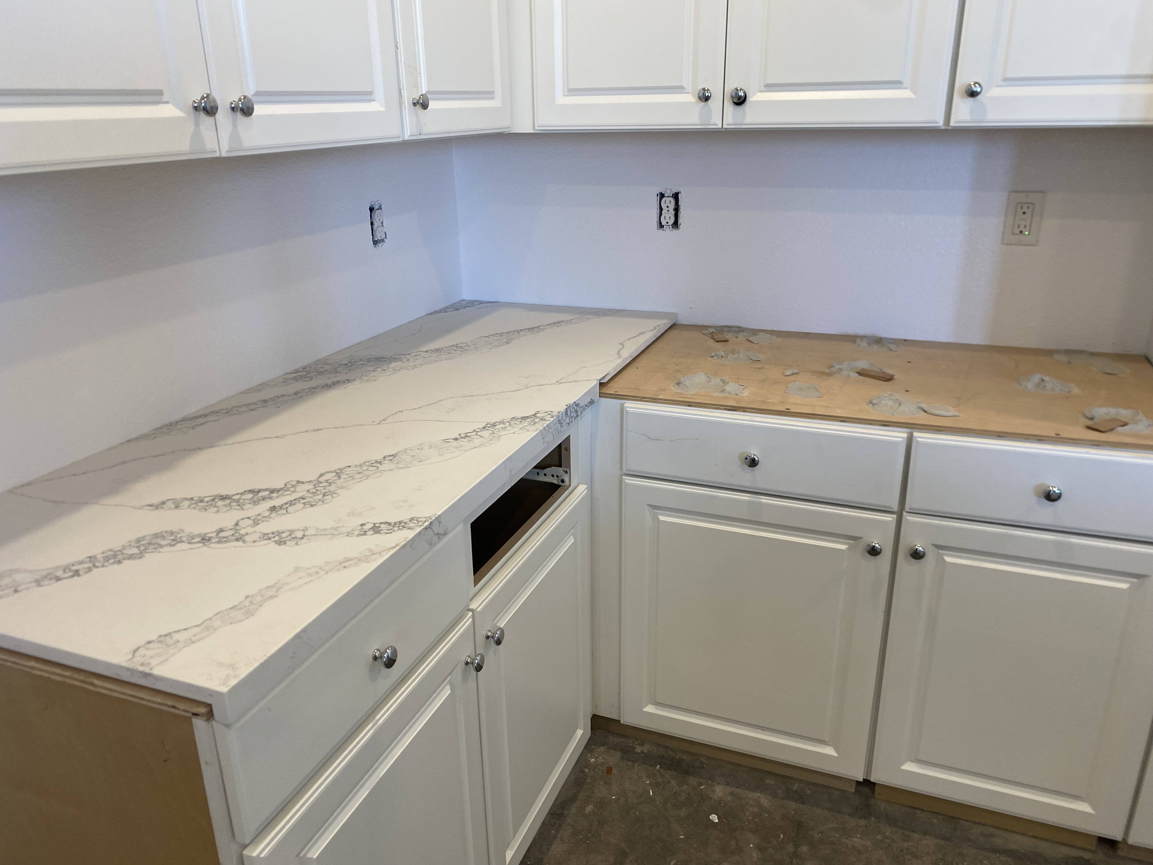 It’s quartz and it is a reno. I’m not to sure what happened but something happened in the house and they had us do the countertops and splashes. There was more work that needed to be done so I think they might change all appliances as well because they don’t got the stone