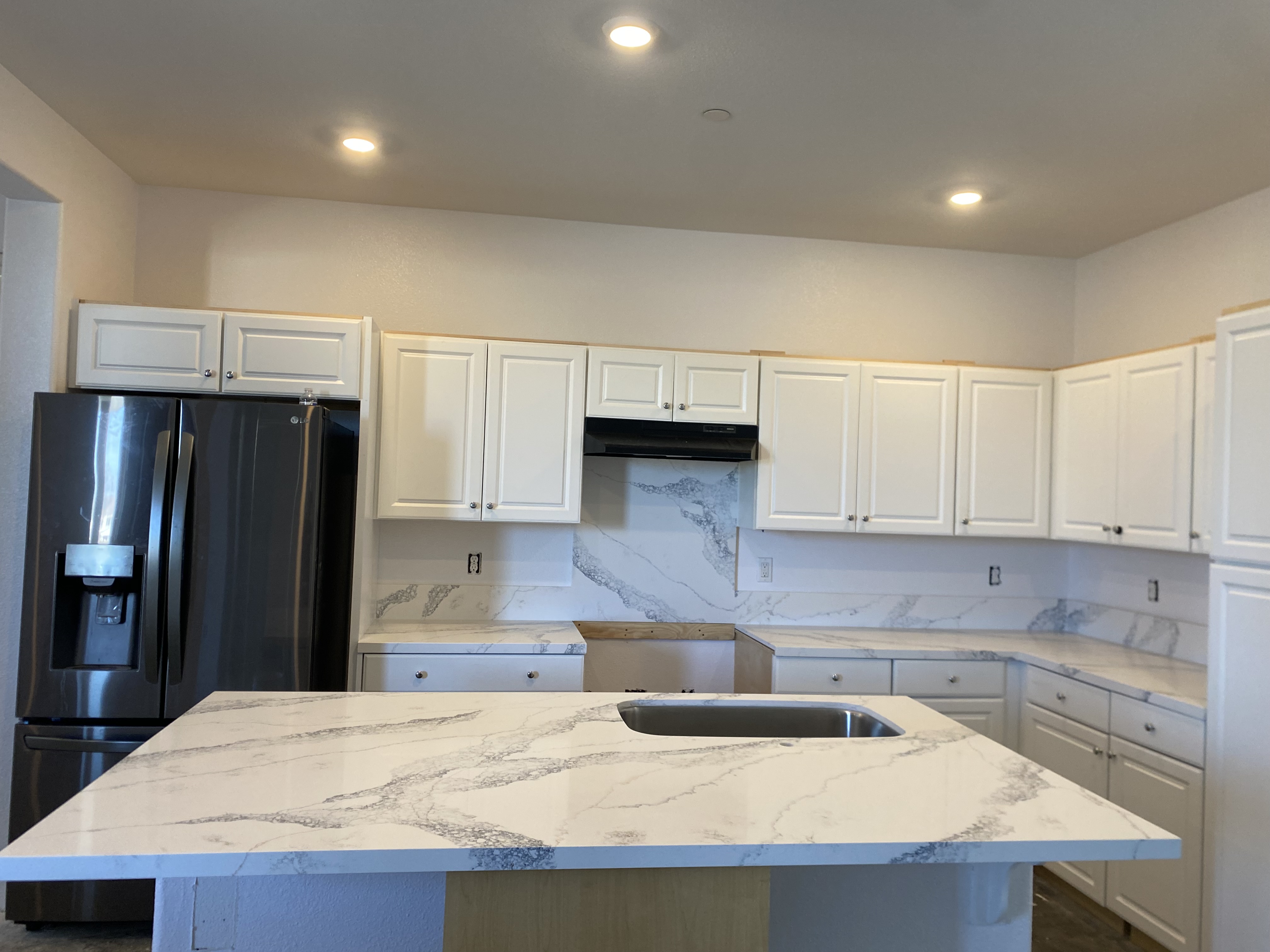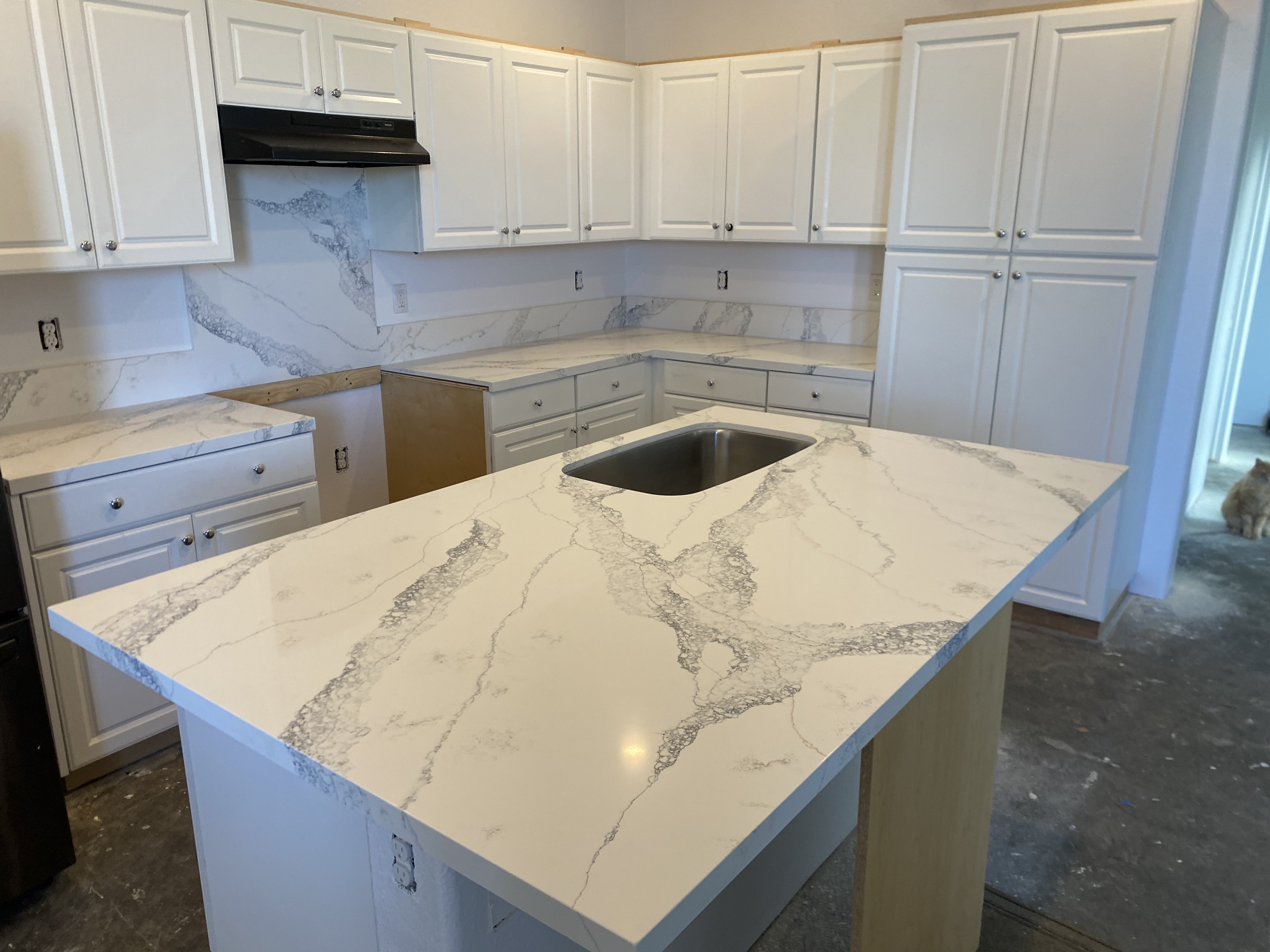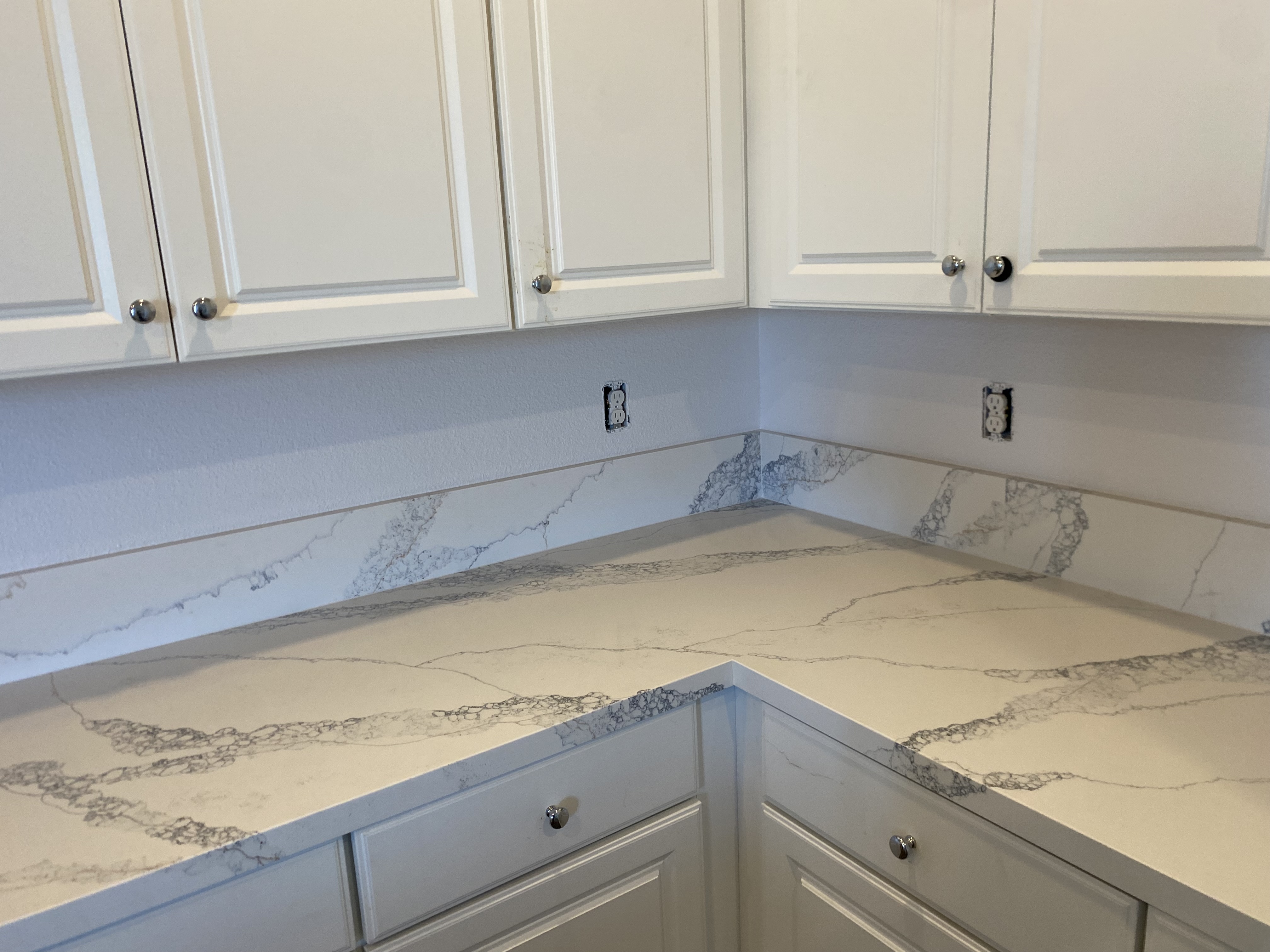 It’s quartz and it is a reno. I’m not to sure what happened but something happened in the house and they had us do the countertops and splashes. There was more work that needed to be done so I think they might change all appliances as well because they don’t got the stone