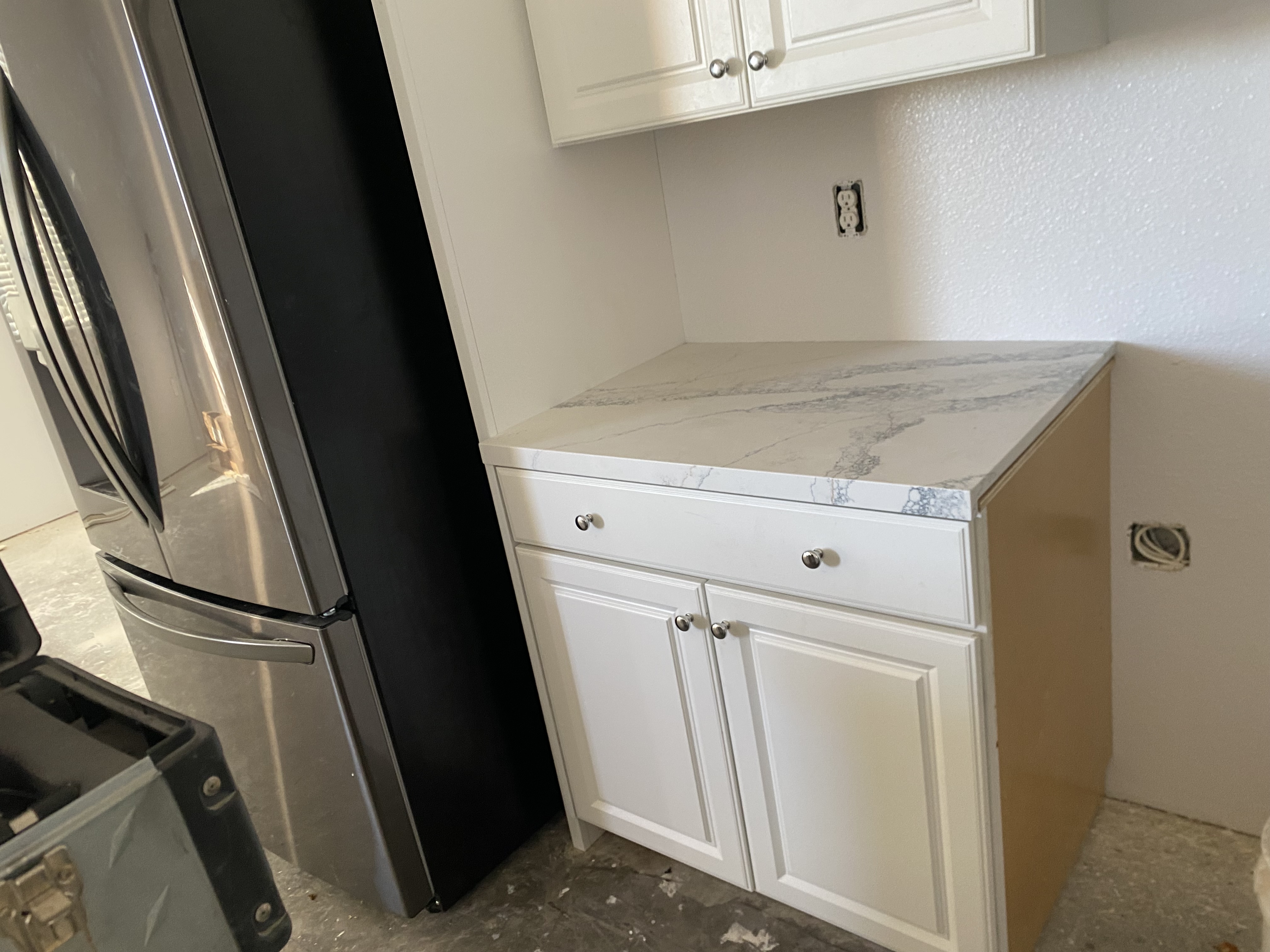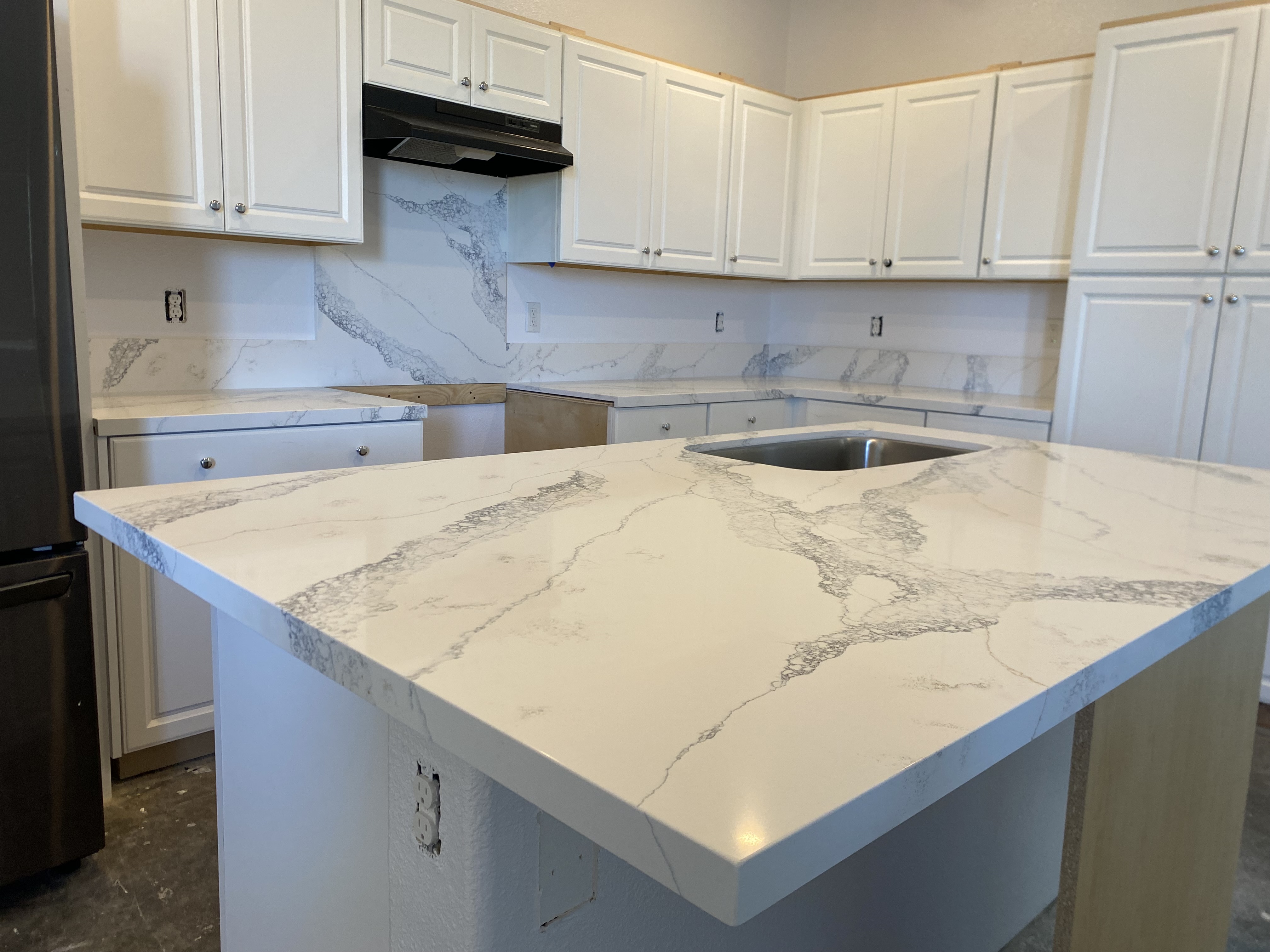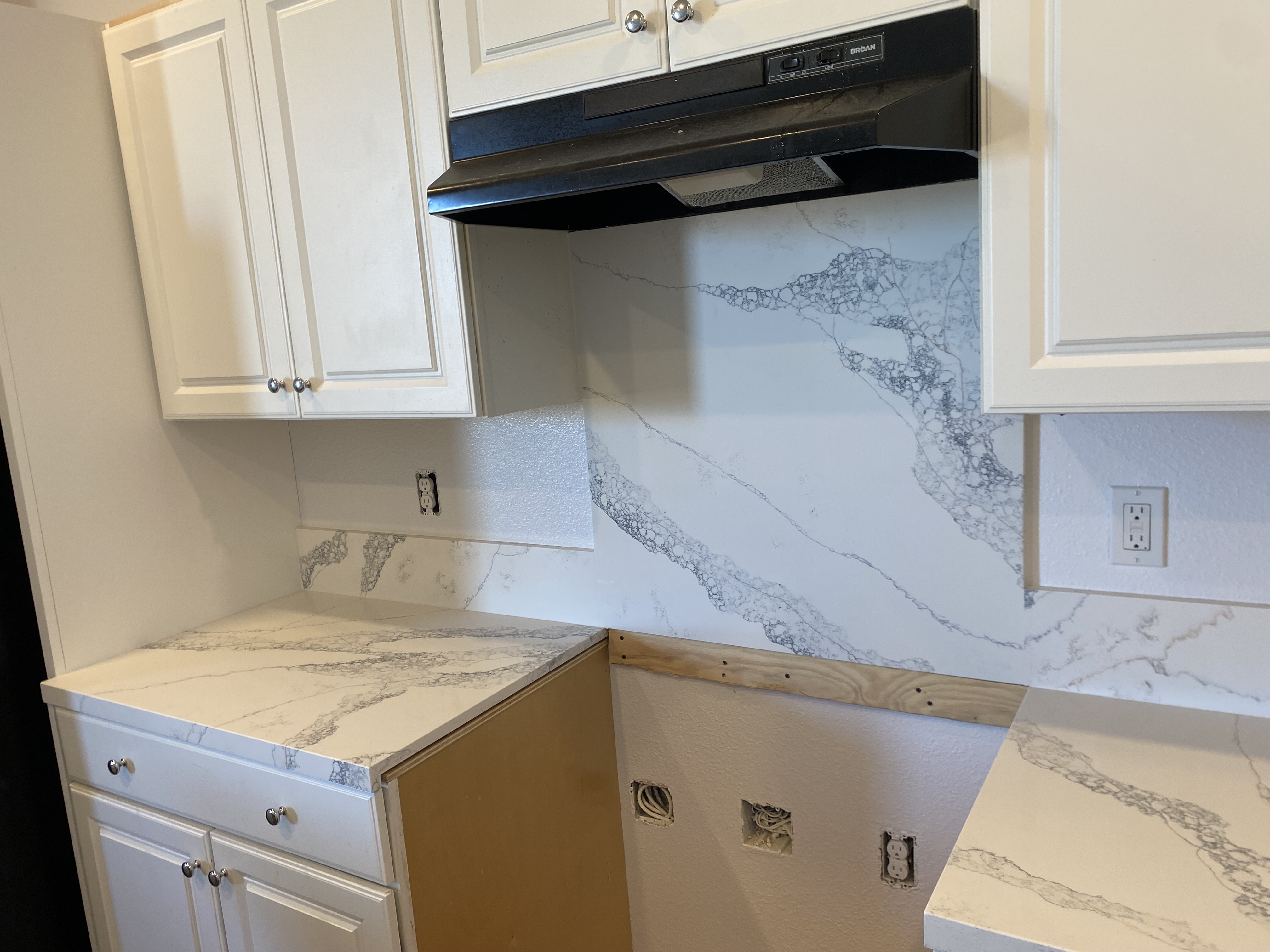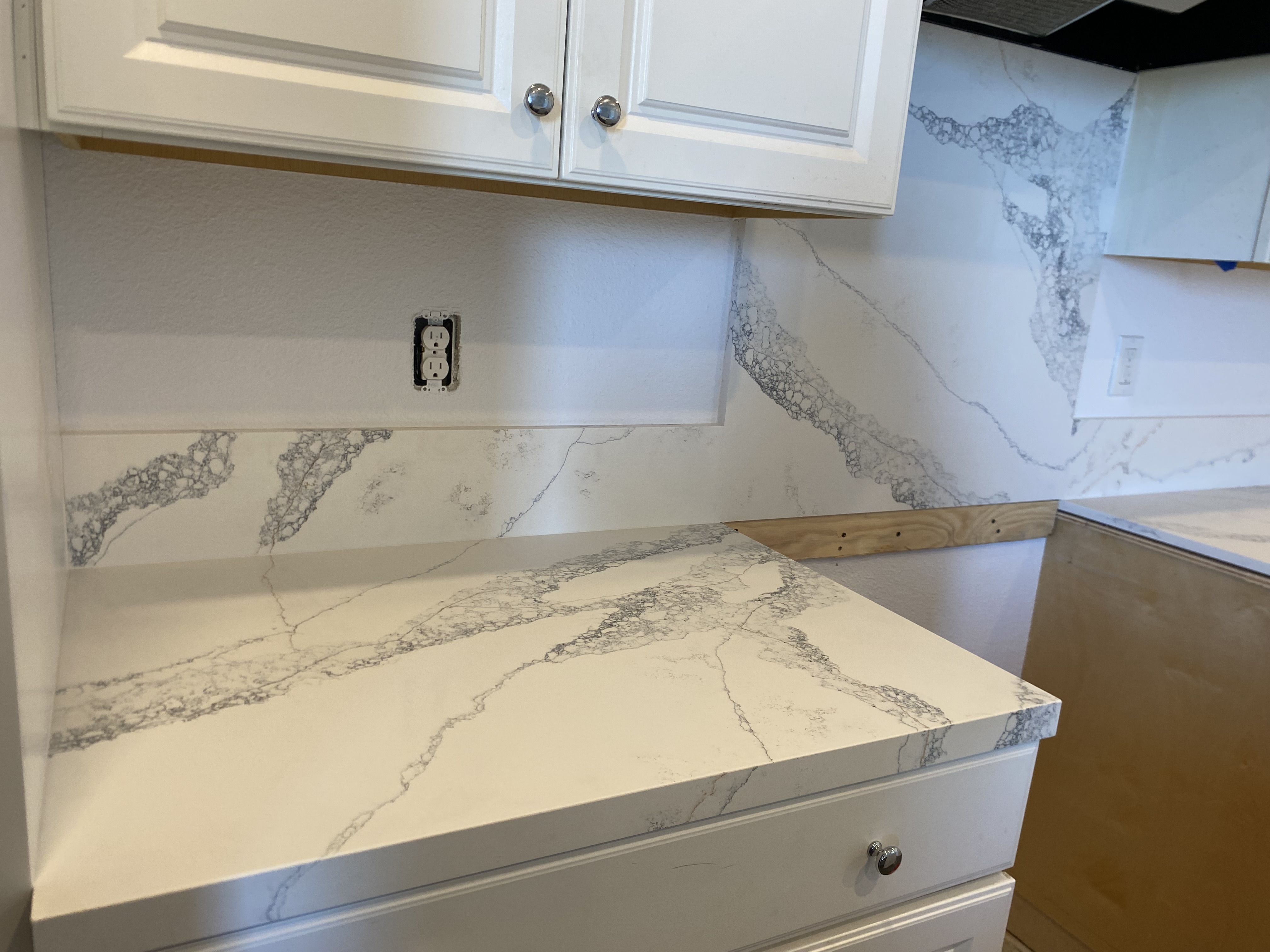 It’s quartz and it is a reno. I’m not to sure what happened but something happened in the house and they had us do the countertops and splashes. There was more work that needed to be done so I think they might change all appliances as well because they don’t got the stone