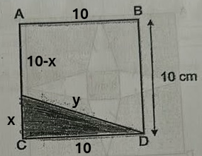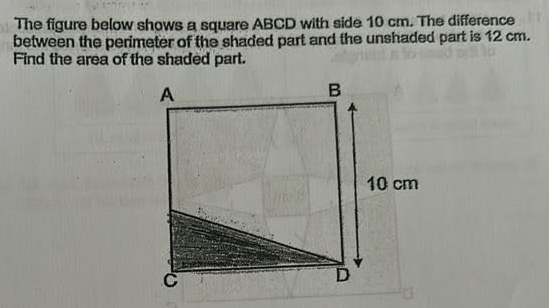 10-x+10+10+yx+y+10-2x+20=12, sox=4A=(10*x)/2=20\DeltaPCD and a quad ABDP\implies10 + 10 + DP + (10-CP) = 10 + PD + CP + 12\implies30 + PD - CP = 22 + PD + CP\implies8 = 2 * CP\impliesCP = 4\DeltaPCD = 0.5 * CP * CD = 0.5 * 4 * 10 = 20 cm²