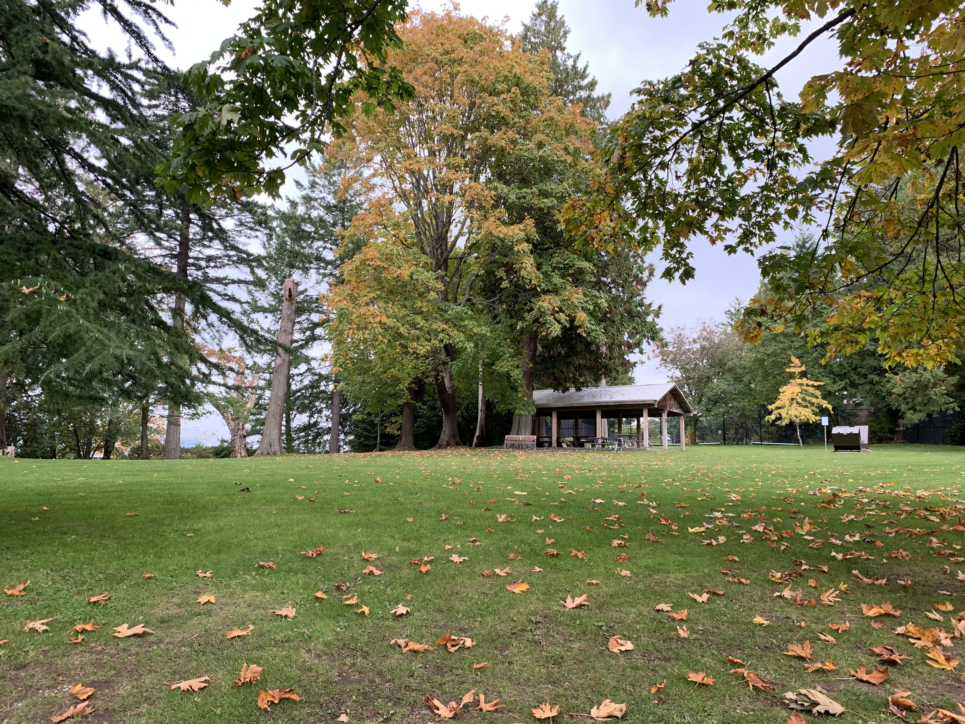 Picnic tables and a nice grass field with plenty of large trees providing shade.