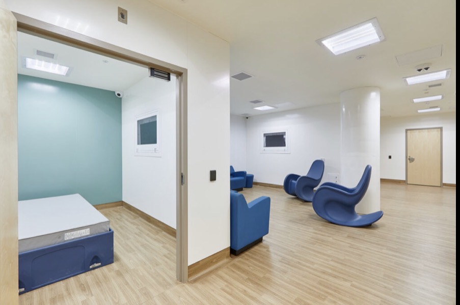 For example, protruding objects and areas like corners that a patient could use to harm themselves must be eliminated from the room. Ligature-resistant design features like tamper-proof outlets, continuous hinges, impact-resistant glass and recessed casework are standard. Furniture is often bolted to the floor and sealed with pick-proof caulking, while air diffusers are designed with serpentine patterns to prevent concealment or access.Managing safety risks also includes designing for excellent line of sight throughout the building, so staff can be aware of patient whereabouts at all times. Nurse stations must be central to patient rooms and shared spaces. Construction and design teams need to communicate with the staff who will be using the spaces to understand how everything needs to work, down to how the doors lock and unlock on interlocking vestibules.