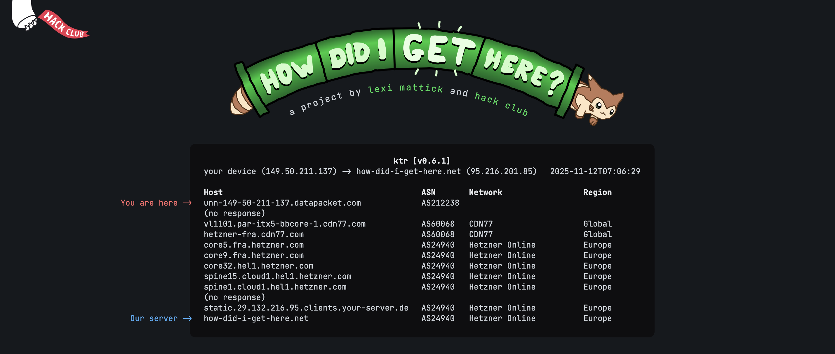To reach this website, your computer sent some packets across the Internet. If we’re curious what that path was, we can run a tool to generate a traceroute — a rough list of every server your packets touched to reach their destination. To build this website (source code on GitHub), I wrote my own traceroute program called ktr (also open source) that can stream results in real time while concurrently looking up interesting information about each hop.