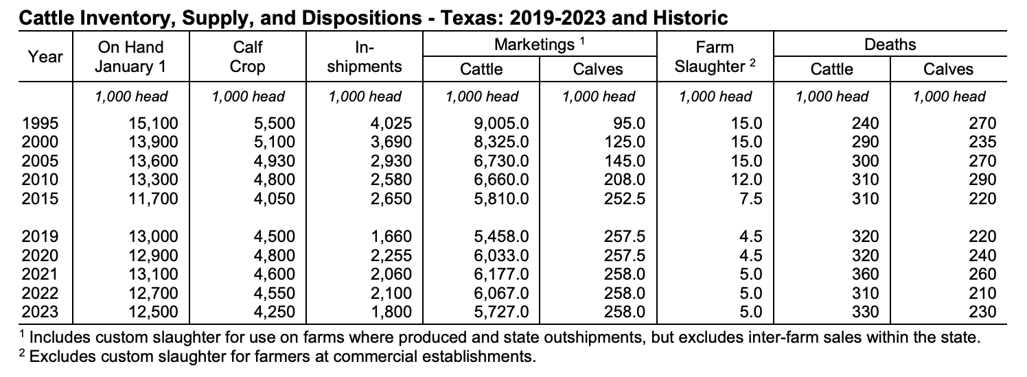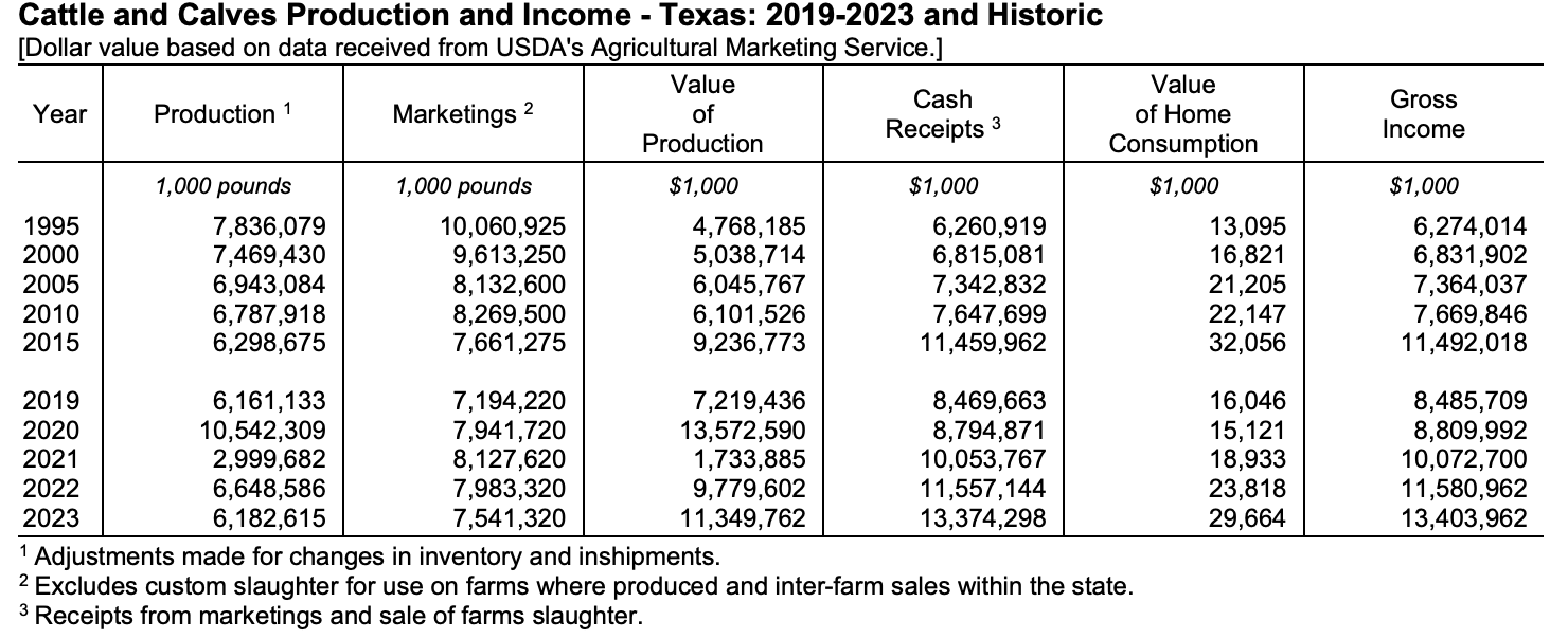 I couldn't find a chart over all of the US, but in Texas at least, that looks about right; a lot fewer heads but relatively stable production weight over time.