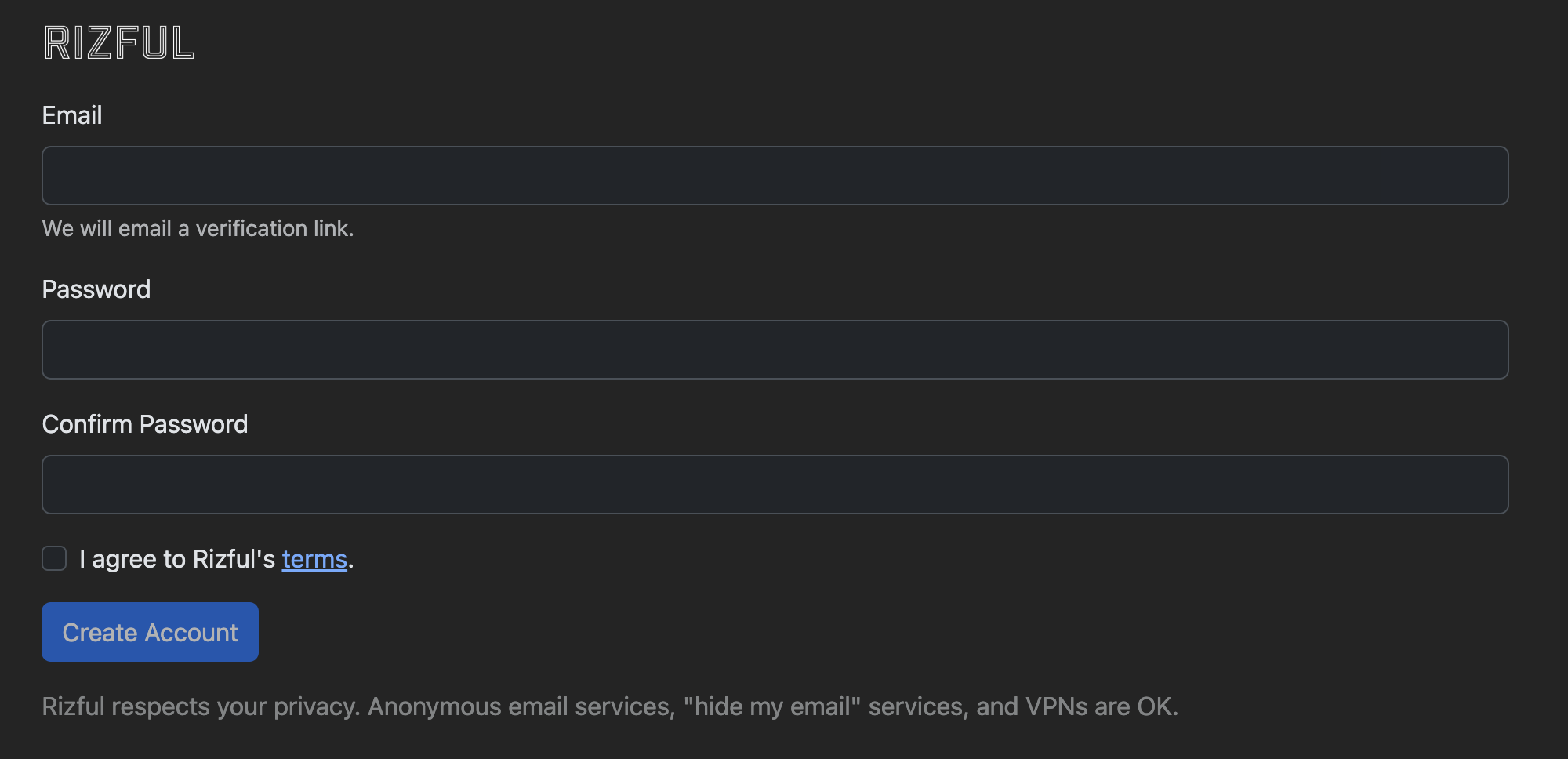 First step, signup and create your custodial lighting wallet at https://rizful.com/w. It's free and it only need an email and a password. You can also use email aliases and temp emails.