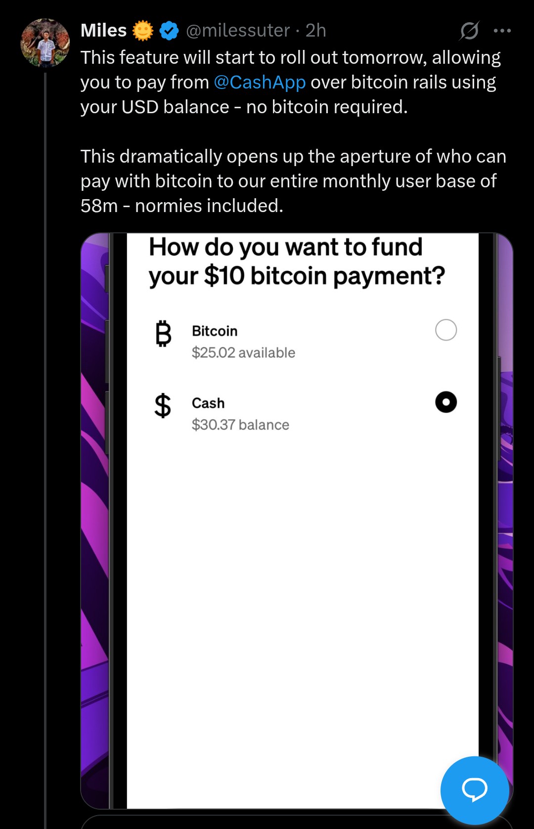 Of course, this depends on anyone actually using this option, which they will not, at any kind of scale, for years. But zero to one is hardest. It's the beginning of a real grounding for btc, which is exciting even in theory.