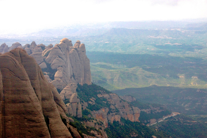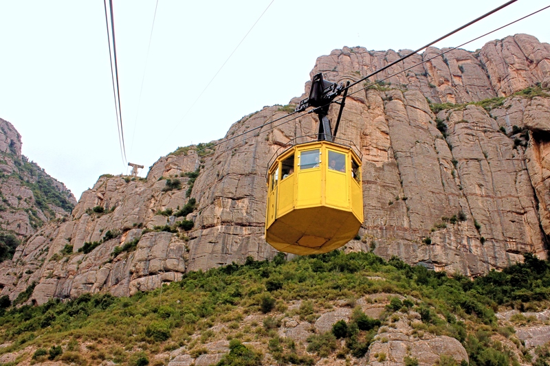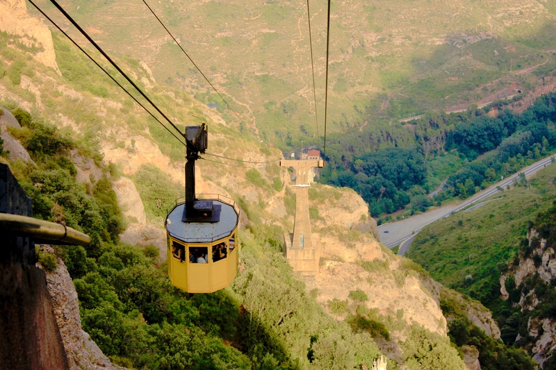 The ride lasts only five minutes, but every second is filled with wonder. The cable stretches steeply across the Llobregat River, climbing toward the jagged peaks that gave the mountain its name — Montserrat, meaning “saw-toothed mountain.” As the car rises, the view of the valley, forests, and tiny roads below feels unreal.