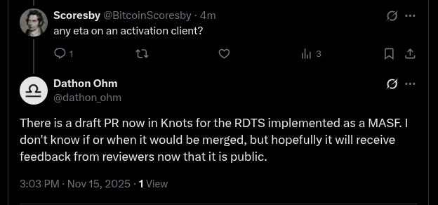 I asked dathan ohm if they knew when the activation client for their soft fork was going to be out and this is what he said: I went to the Knots repo and found this PR: https://github.com/bitcoinknots/bitcoin/pull/234