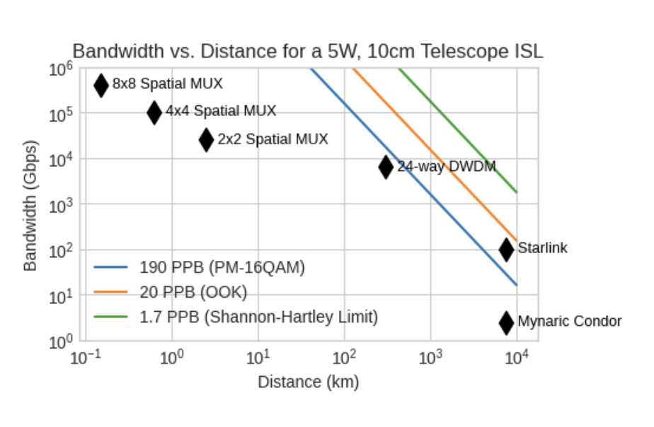 These power levels can be achieved by drastically reducing the inter-satellite distance. Since for distances larger than the Fresnel limit, received power scales with the inverse square of the distance due to beam divergence, flying the satellites in close formation (hundreds of kilometers, or less) provides ample power to close the link budget for high bandwidth COTS transceivers, as illustrated above in Figure 1. As the distance becomes very short (e.g., ∼10km for a 10 cm telescope), spatial multiplexing emerges as a new opportunity for further scaling.