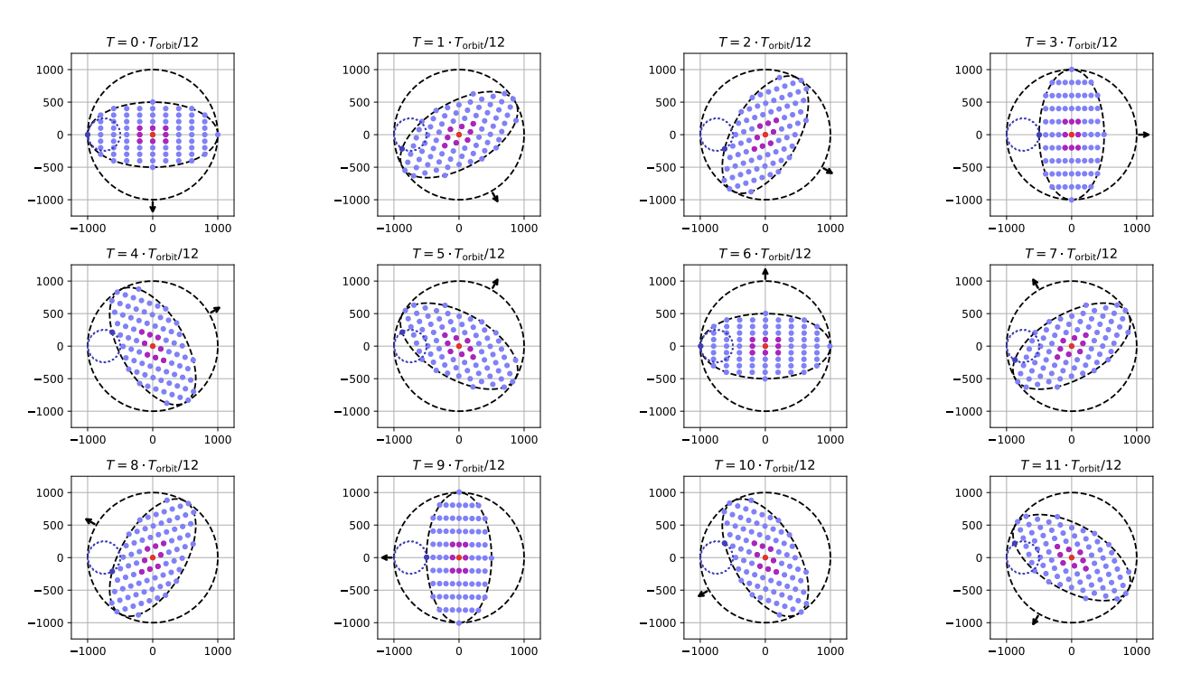 Figure 2 shows one possible configuration for an illustrative, planar 81-satellite constellation—-all placed in the orbital plane, at a mean cluster altitude of 650 km. The arrangement here is based on a square rather than hexagonal lattice, mostly to simplify its description. Cluster radius is R=1 km, with distance between next-nearest-neighbor satellites oscillating between (approximately) 100 and 200 m, as is shown in Fig. 3. We note that, of course, evolving constraints could change the optimal architecture for our constellation.