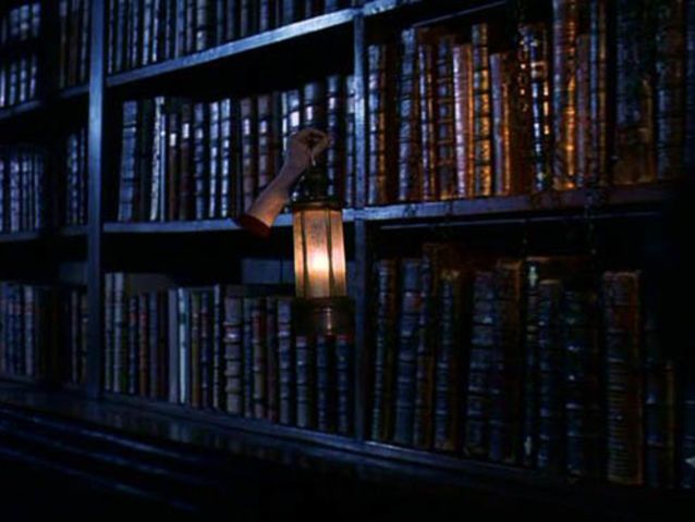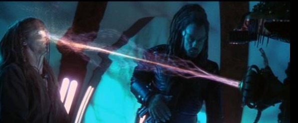 caption: the Psychlo learning machine from the movie Battlefield Earth (2000); this scene echoes the scene from The 5th Element (1997) where Leeloo learns about War; looking at the uncomfortable truth is required for evolution of consciousness;