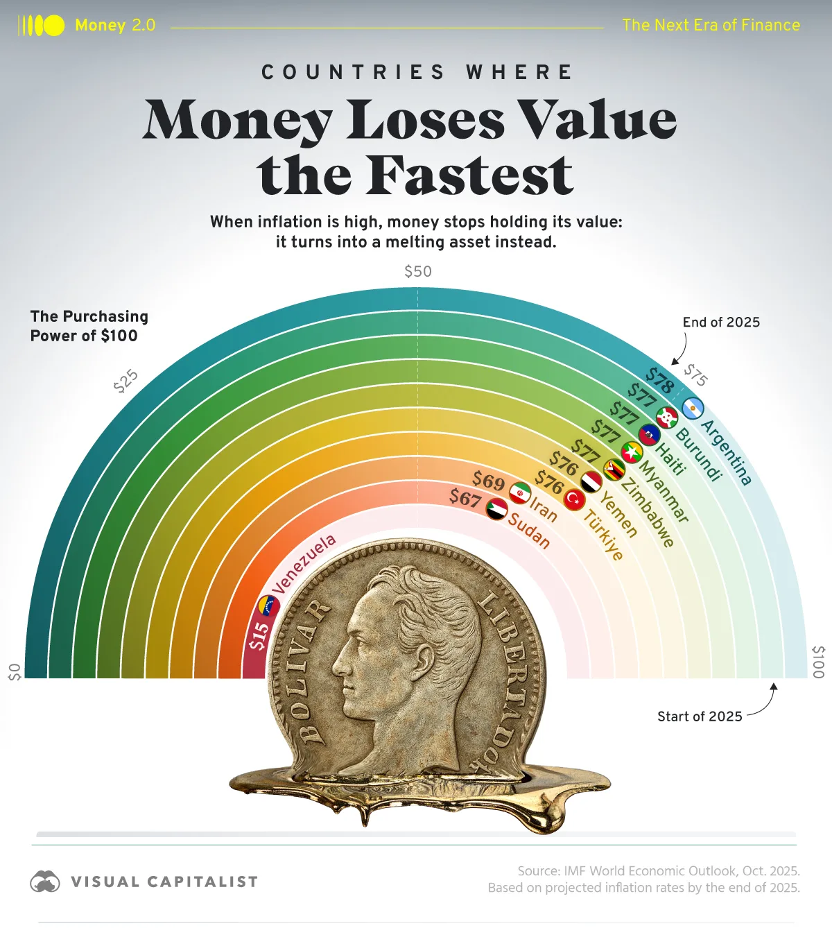 Imagine earning $100 in January, only to have it buy less than $80 worth of goods or services by December. That’s how fast inflation is eating away at purchasing power in some countries.This graphic, created in partnership with Plasma, highlights countries with the highest inflation rates and what $100 could be worth by the end of 2025. It’s part of our Money 2.0 series, where we highlight how finance is evolving into its next era.