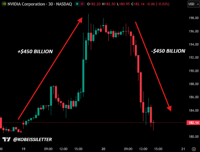 On Tuesday (November 19th), Nvidia gained approximately $450 billion in market value during the morning/pre-market and early trading session.