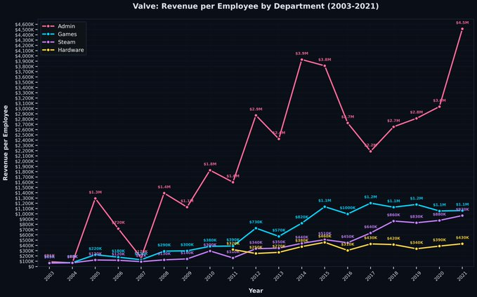 Valve, the creator of Steam, Half-Life, and Counter-Strike, grossed approximately US$17 billion this year and employs around 336 people. This represents over US$50 million per employee, the highest figure for any company (not related to cryptocurrencies) in the world. The average salary is approximately US$1.3 million per person. One of the most efficient companies of all time.