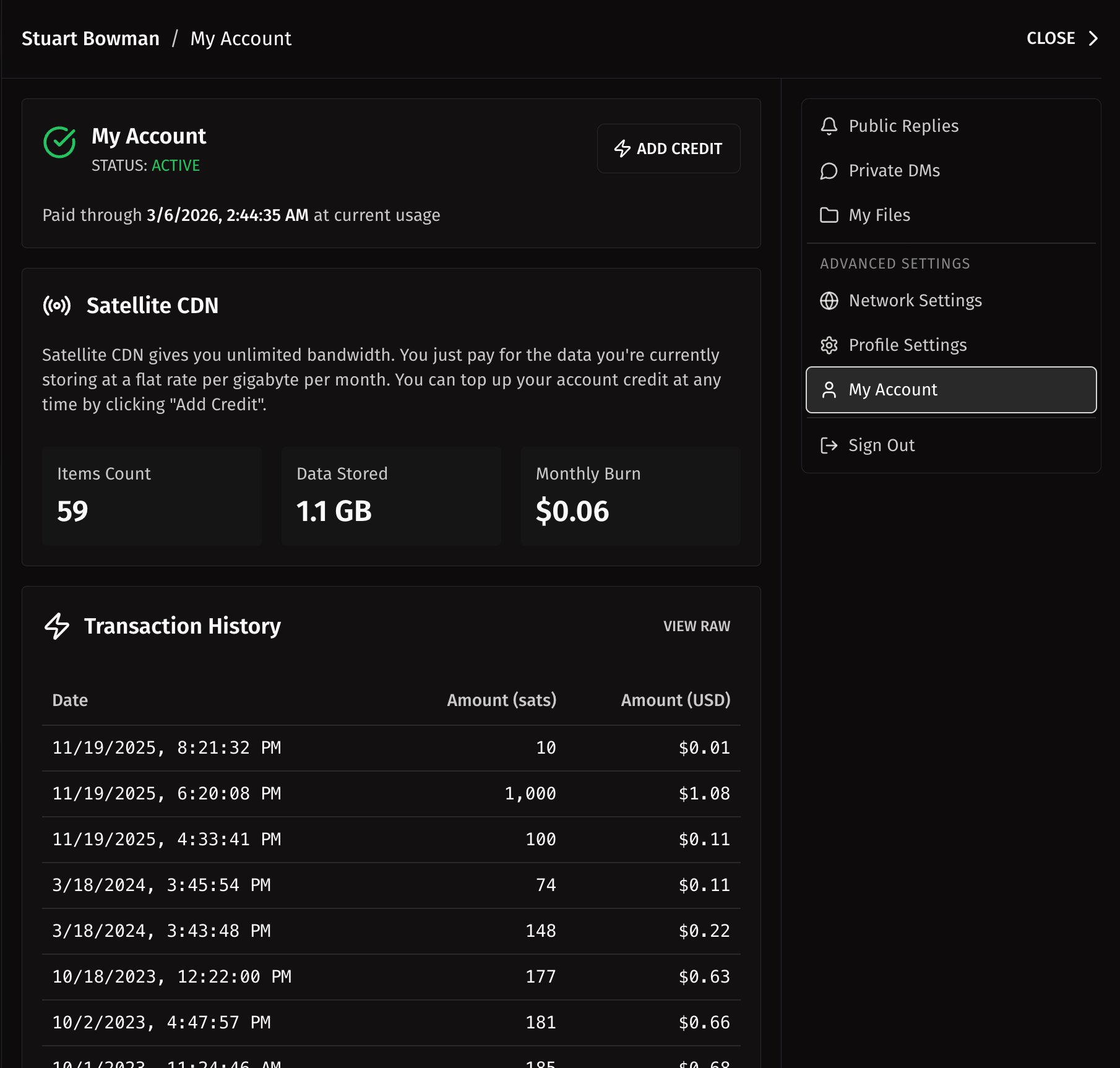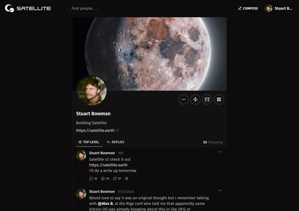 What's up guys After my year break from social media I deployed the total rebuild of satellite.earthI created over course of these past 12 months. It's a major upgrade. The old Satellite was cool aesthetically but was not functional enough to be a daily driver. I had to fix this, to make the nostr client that I've always wanted. Something beautiful that gets the basics right. I changed the front page and the profile pages to focus on just what you're looking for, but I kept reddit-style threads because they are amazing for reading long conversations, e.g https://satellite.earth/thread/note15yhl85e6jnayprt3ufp4ucuzwqry0uxd8sxqn4twctxxf4gkfdpsfyea0eI got rid of NIP-172 communities. They were just too messy. I'm working on replacing them with relay-based communities instead (something like what @ hodlbod has been cooking). This will be ready and deployed in the near term. In the meantime, straight up relay feeds are already functional. You just have to type the url in yourself, e.g. https://satellite.earth/thread/note15yhl85e6jnayprt3ufp4ucuzwqry0uxd8sxqn4twctxxf4gkfdpsfyea0eYou can create aggregate relay feeds too by just including multiple comma separated relays in the url, e.g. https://satellite.earth/relay/pyramid.fiatjaf.com,relays.land/spatianostraSatellite CDN got reworked and refreshed as well. You can now see all your transactions, your current balance, and your burn rate. It's way more clear now what's going on.