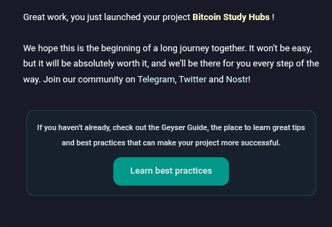 The Geyser launch fee is fully covered. Now let’s build Bitcoin Study Hubs.