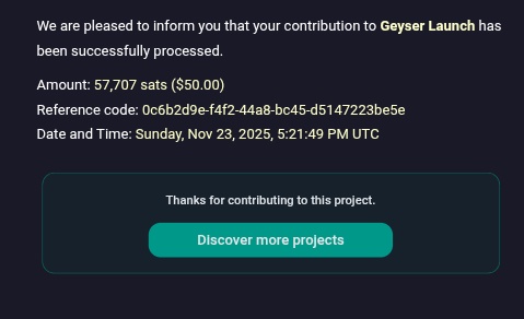 The project is fully written, approved, and now officially launched on Geyser thanks to the Bitcoiners who stepped up and covered the launch fee.