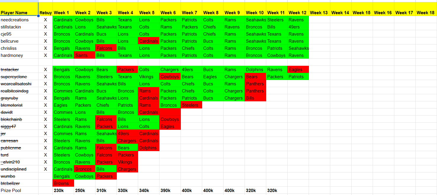 One player was eliminated this week. Our defending champion @TNStacker (Eagles). Thanks for playing. We are down to 6 competitors and will have a new champ this year.