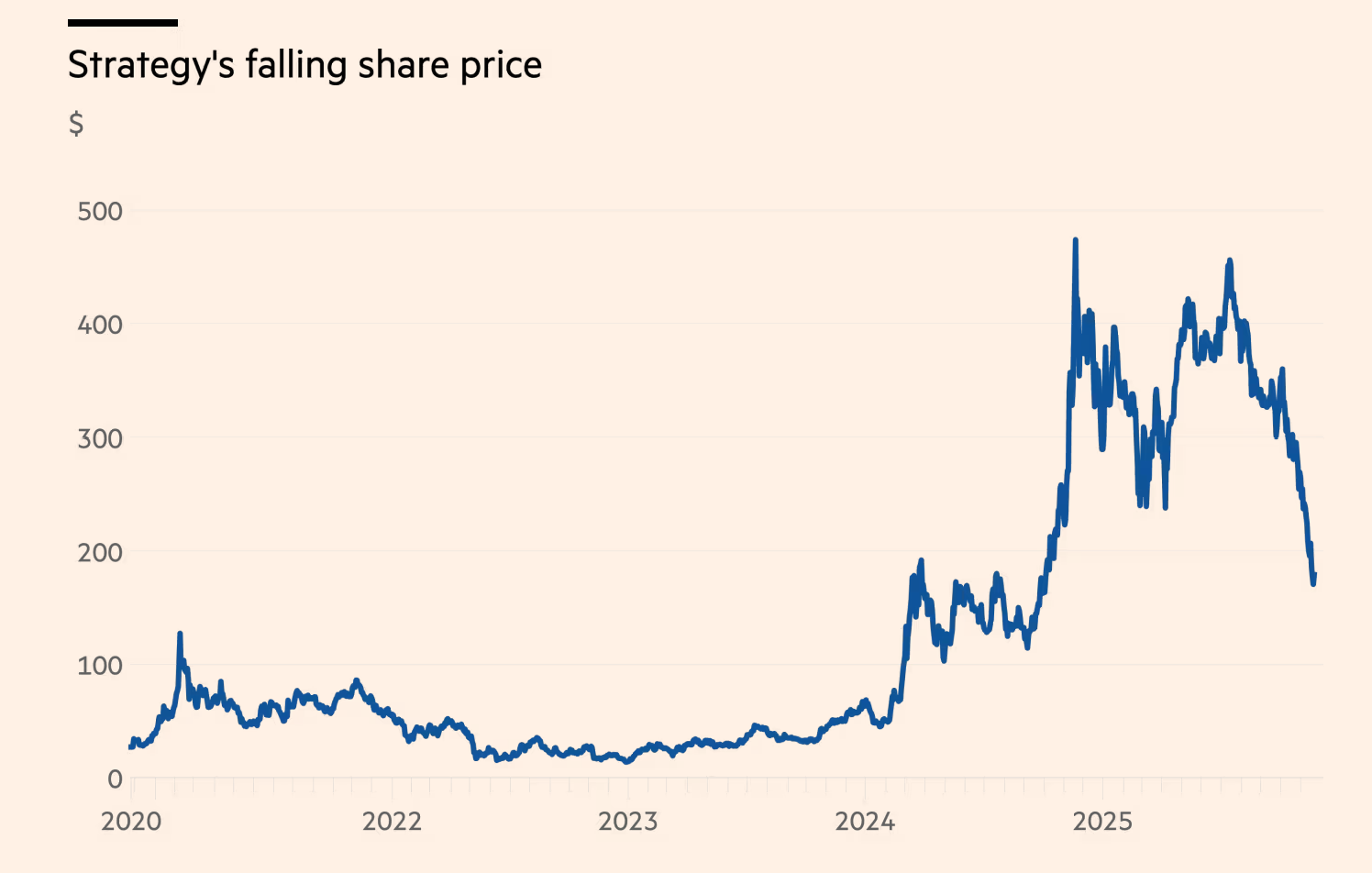 With Saylor’s company now worth less than the bitcoin it holds, investors worry that a business model that relied on a virtuous circle of rising crypto prices and massive share and debt issuance is now unravelling.