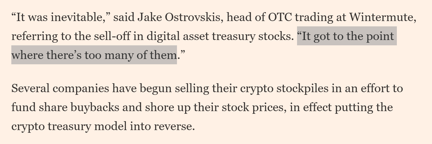 While bitcoin and ether sellers can find buyers, companies with more niche tokens will find it more difficult to raise money from their holdings, according to Morgan McCarthy. “When you’ve got a medical device company buying some long-tail asset in crypto, a niche in a niche market, it is not going to end well,” he said, adding that 95 per cent of digital asset treasuries “will go to zero”.