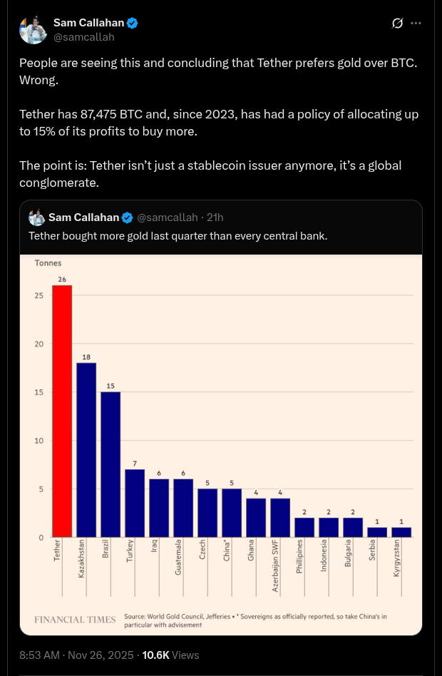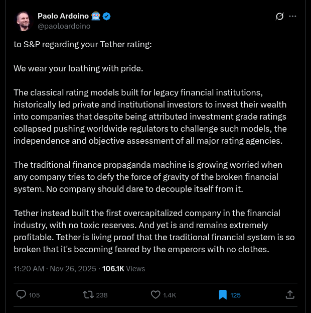 The rating agency cited concerns over Tether’s increased exposure to volatile assets like Bitcoin and gold in its reserves, which creates potential depegging risks for the stablecoin. S&P Global also pointed to gaps in disclosures and governance as factors in the downgrade.
